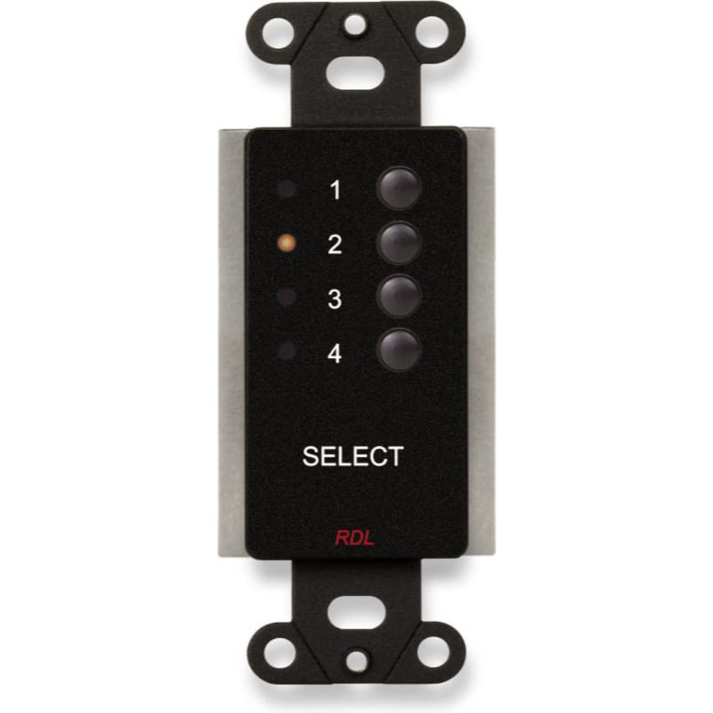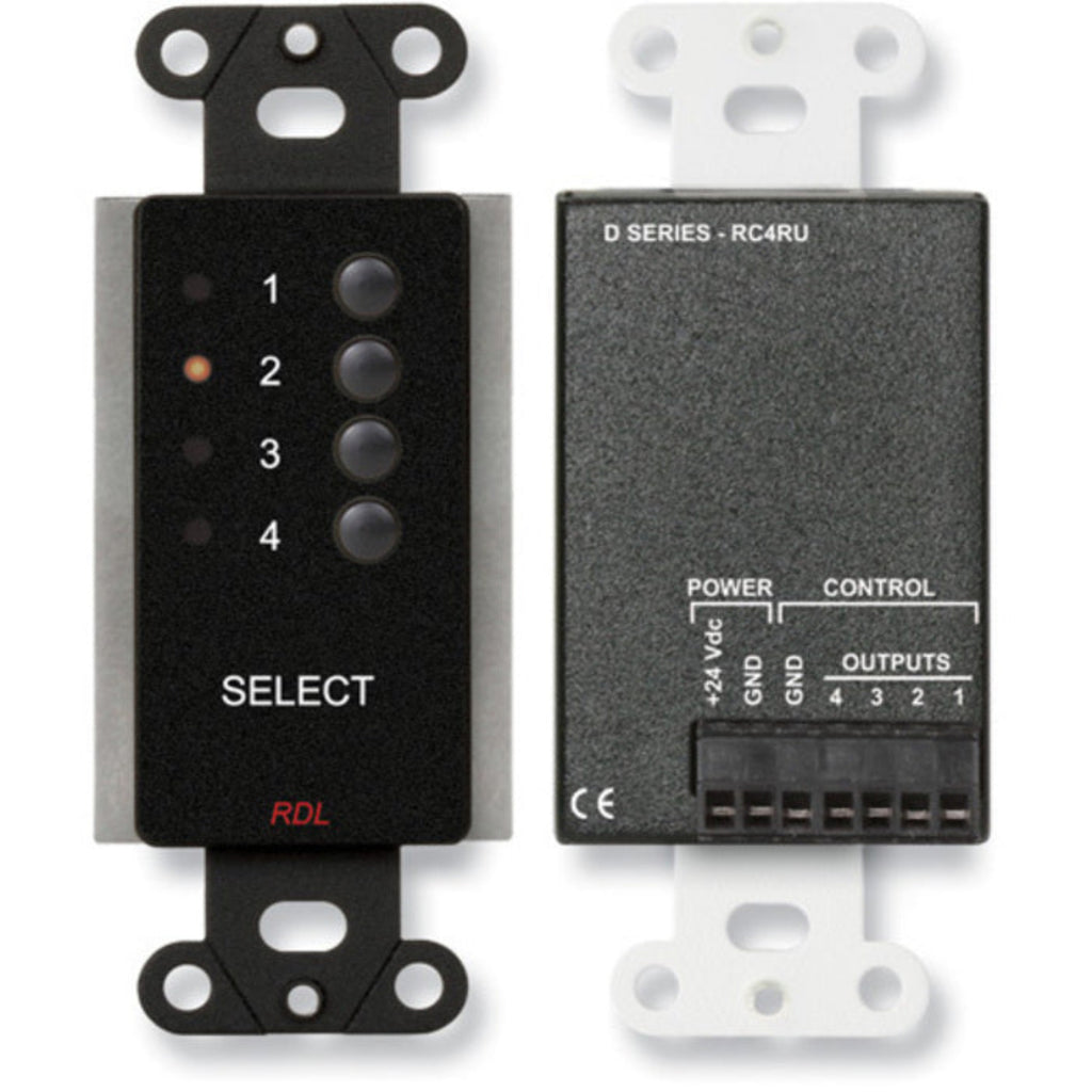 The DB-RC4RU is a wall-box mounted remote module designed to directly control an RDL RU-SX4A Audio Switcher Module. The RU-SX4A provides solid state switching of one of four balanced/unbalanced audio inputs to a single balanced/ unbalanced audio output. The DB-RC4RU connects directly to the power and SLAVE terminals of the RU-SX4A using a 3-pair cable (or a 6-conductor cable). The DB-RC4RU may be used to directly control the RDL RU-VSX4 Video Switcher.