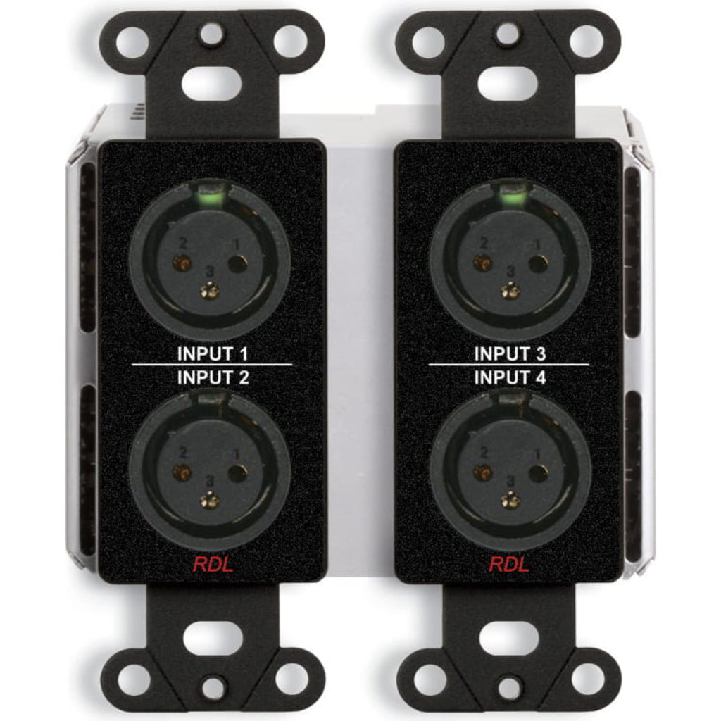The DD-BN40 is a complete wall-mounted Dante audio network interface. It features four XLR mic or line inputs on the front panels and two line outputs on a rear-panel detachable terminal block. Special software is not required to configure the DD-BN40. Each input provides three switches that may be set from the front of the unit when the cover plate is not installed. One switch enables or disables P48 phantom for that input; the second switch selects the mic or line gain range; the third switch sets the gain. Each output provides a switch to set the output to balanced professional or unbalanced consumer level. The DD-BN40 fits a standard US dual-gang electrical box or an RDL WB-2 back box for installations in thinner European or equivalent walls. The DD-BN40 is PoE powered, and is available in multiple finishes with optional customized graphics.