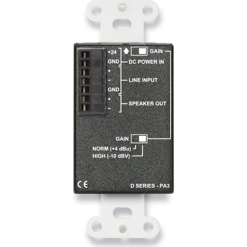 The D SERIES DS-PA3 is a high efficiency 3.5 W power amplifier with two line inputs and an amplified output to drive a 4 or 8 ohm speaker. The DS-PA3 features a balanced line level input that may be connected unbalanced. The gain range will accommodate standard unbalanced levels as well as professional balanced levels.