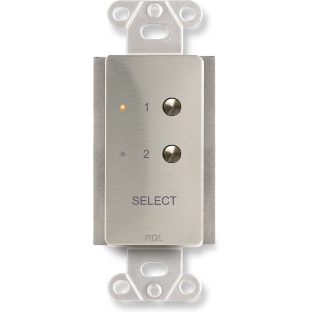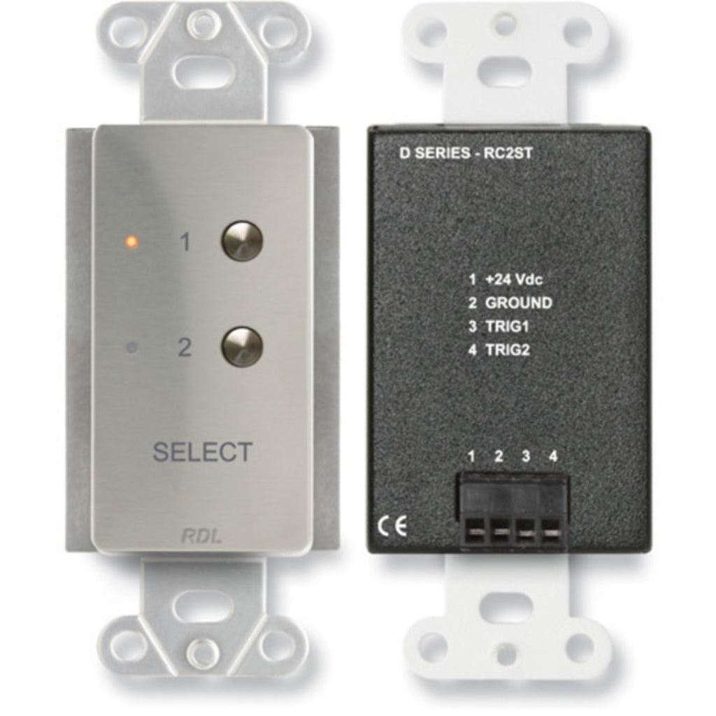 The front panel of the D-RC2ST features two pushbuttons with two associated LEDs. Upon initial power-up, source 1 is selected. Touching the other button de-selects source 1 and immediately selects source 2. An LED adjacent to each button shows which source is selected.