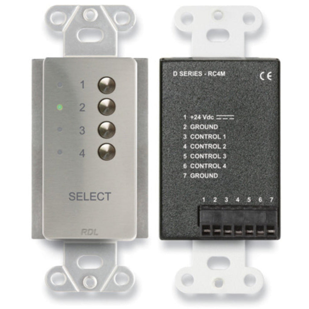 The D SERIES-RC4M is a remote control that provides source selection at single or multiple locations. The -RC4M is designed to directly connect to an RDL 4-channel switching module controlled by external momentary pushbuttons. The front panel of the -RC4M features four pushbuttons, each corresponding to one of four inputs. An LED adjacent to each button shows which source is selected. When an -RC4M is not being used, its display switches to a dim intensity to avoid being a visual distraction. The display returns to a bright intensity when a button is pushed.