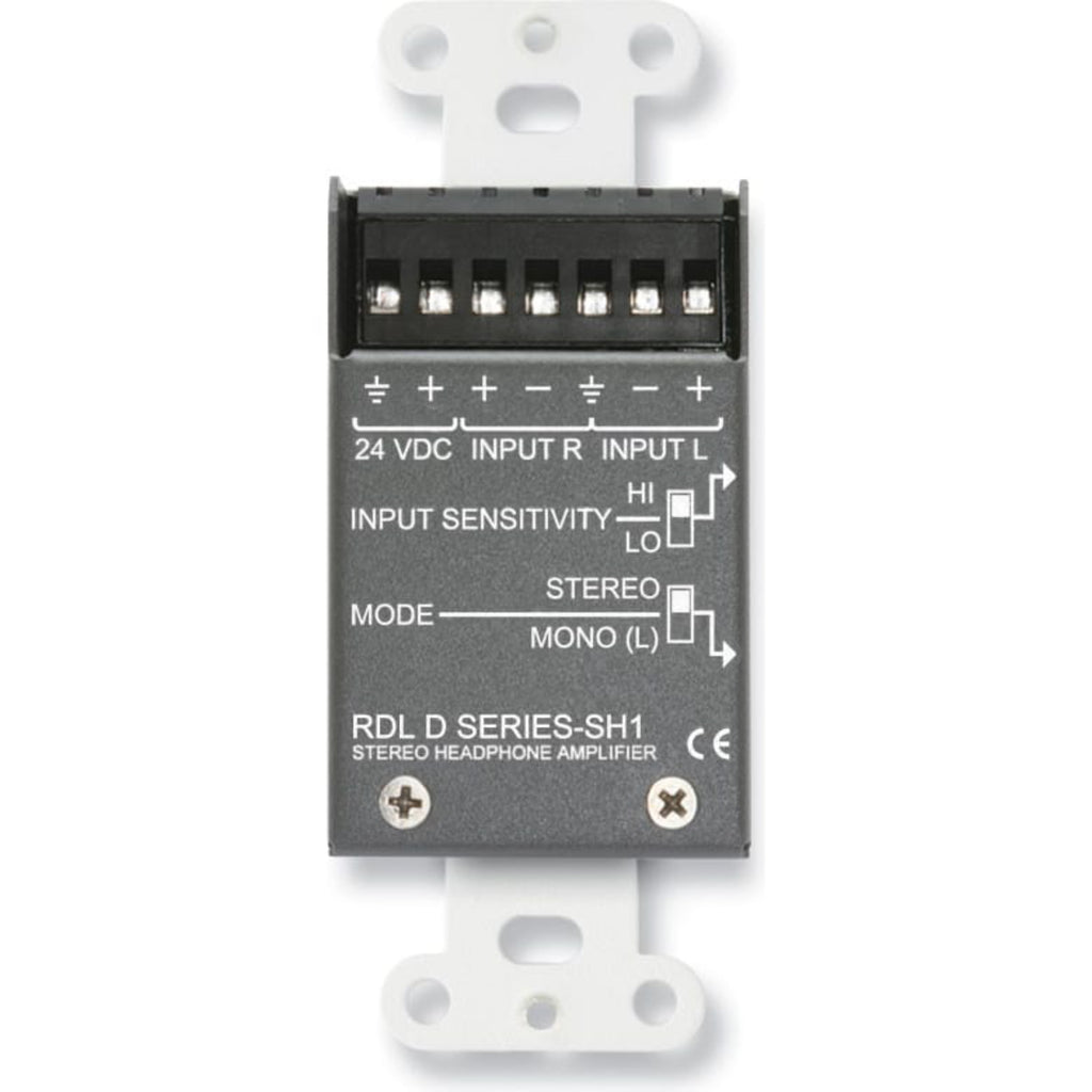 The D/DS SH1 is used in applications requiring headphones of any impedance to be driven from consumer or professional audio sources. The D/DS-SH1 is ideally suited to applications as diverse as language translation, museums, interview studios and music stores. The module mounts conveniently in a precut opening in a wood or metal enclosure or in various RDL mounting accessories. The D/DS SH1 is a dual channel headphone amplifier with balanced/unbalanced left and right inputs. Each input accepts operating levels between 20 dBV and +20 dBu. Two recessed slide switches located on the side of the rear enclosure are set prior to mounting the module. One switch is provided for setting the input sensitivity. The mode switch selects between stereo and mono operation. In the mono position, the left input is used to drive both output channels. When the module is used in a monaural system, only the left channel input must be wired. The front panel level control is a long life potentiometer controlling matched VCAs. Audio does not pass through this control, assuring years of noise free level adjustment. The output amplifiers deliver more than 50 mW into either high or low impedance headphones through a durable, metal 1/4" (6.3 mm) standard headphone jack. Module operation is from a 24 Vdc ground referenced power supply. It can also operate from a 12 Vdc supply with a 6 dB reduction in headroom and a maximum output power of 10 mW.