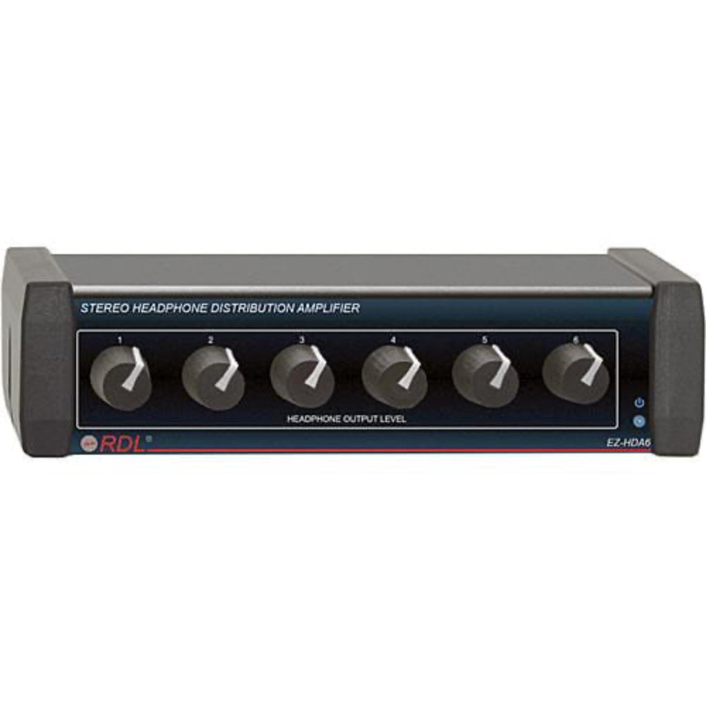 The EZ-HDA6 contains six stereo headphone amplifiers with individual front-panel volume controls. Headphone outputs are provided on rear-panel 1/4" jacks. One input signal feeds all the amplifiers. Stereo RCA jacks, a MINI jack and a dual 1/4" jack (for "loop out" connection) are provided for connecting the input source. The EZ-HDA6 is used in music stores, houses of worship, studios, museums, home component systems and commercial sound systems.