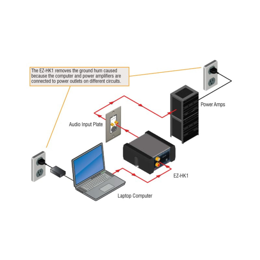 The EZ-HK1 eliminates hum due to ground loops when it is installed between an unbalanced audio source, such as a computer, CD player, cassette player or other consumer audio product, and the input of a grounded amplifier in an audio system.