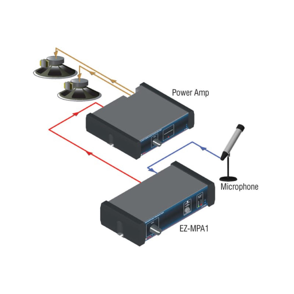 The EZ-MPA1 is a microphone preamplifier with front-panel volume control and audio level metering. A front-panel switch engages an audio compressor to control overloads and clipping during high level audio bursts or peaks from the microphone. Dynamic or condenser microphones are both supported with rear-panel switchable phantom voltage. The preamplified mic signal feeds both channels of the line output on RCA or MINI jacks. LED VU metering facilitates easy level adjustment. The EZ-MPA1 is ideal to add microphone inputs to mixers and amplifiers with line inputs. It is used in houses of worship, restaurants, clubs, meeting rooms, educational facilities, conference rooms, studios and commercial sound systems.