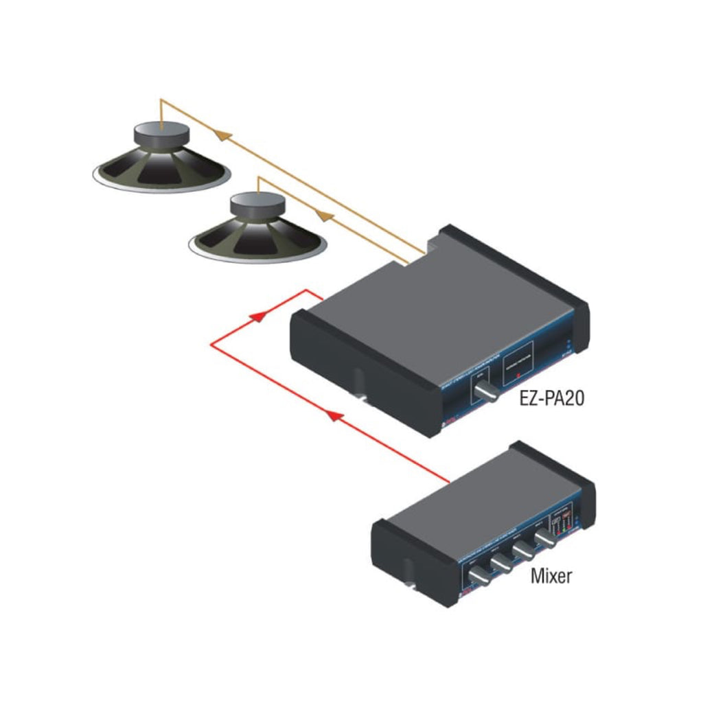 The EZ-PA20 is a stereo audio amplifier with one line input and a front-panel volume control. An integral compressor/limiter allows a higher sound output level without clipping than is possible using a standard amplifier. The output drives 4 or 8 ohm speakers. The EZ-PA20 is used in houses of worship, restaurants, clubs, meeting rooms, educational facilities, conference rooms and commercial sound systems.