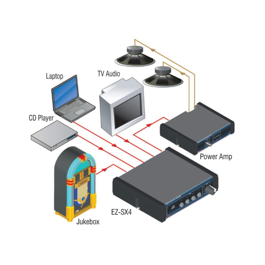 The EZ-SX4 is a stereo audio source selector with an output volume control that adjusts the line-level output. This unit is ideal as a four input source selector feeding an associated audio amplifier. The user can conveniently select an audio source and adjust the level on the front panel. The EZ-SX4 is used in stores, houses of worship, restaurants, clubs, home component systems and commercial sound systems.