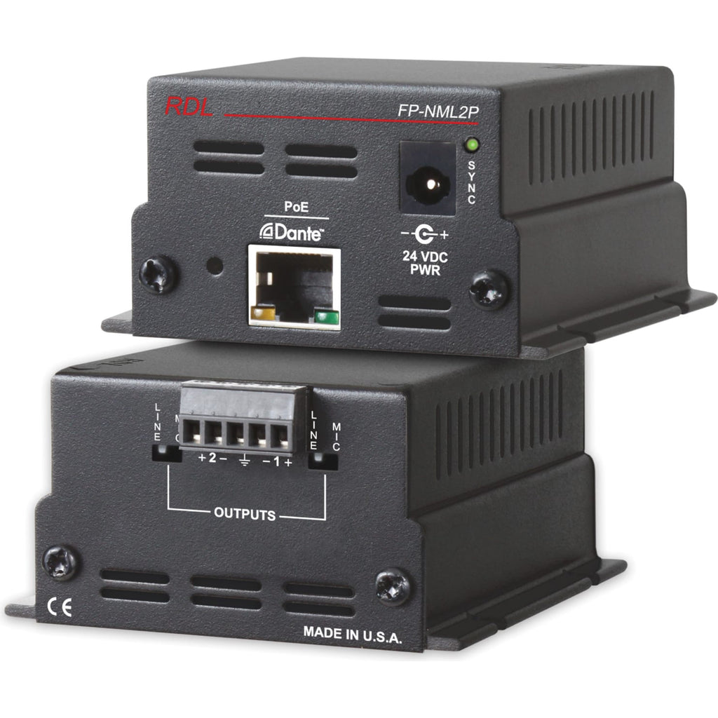 APPLICATION: The FP-NML2 is a high quality converter that provides professional line-level outputs from two Dante network audio channels. Each line output provides +4 dBu balanced for a network digital audio level of -18 dBFS. The professional output directly interfaces with other professional and commercial equipment without the need for additional gain. Crosstalk is below the noise floor between all outputs across the entire audio spectrum. The noise floor is better than 80 dB below operating level with greater than 18 dB of headroom. Each output is equipped with a recessed mic/line switch that provides 50 dB of attenuation to feed the microphone input of a mixer-amplifier or other equipment with mic inputs.