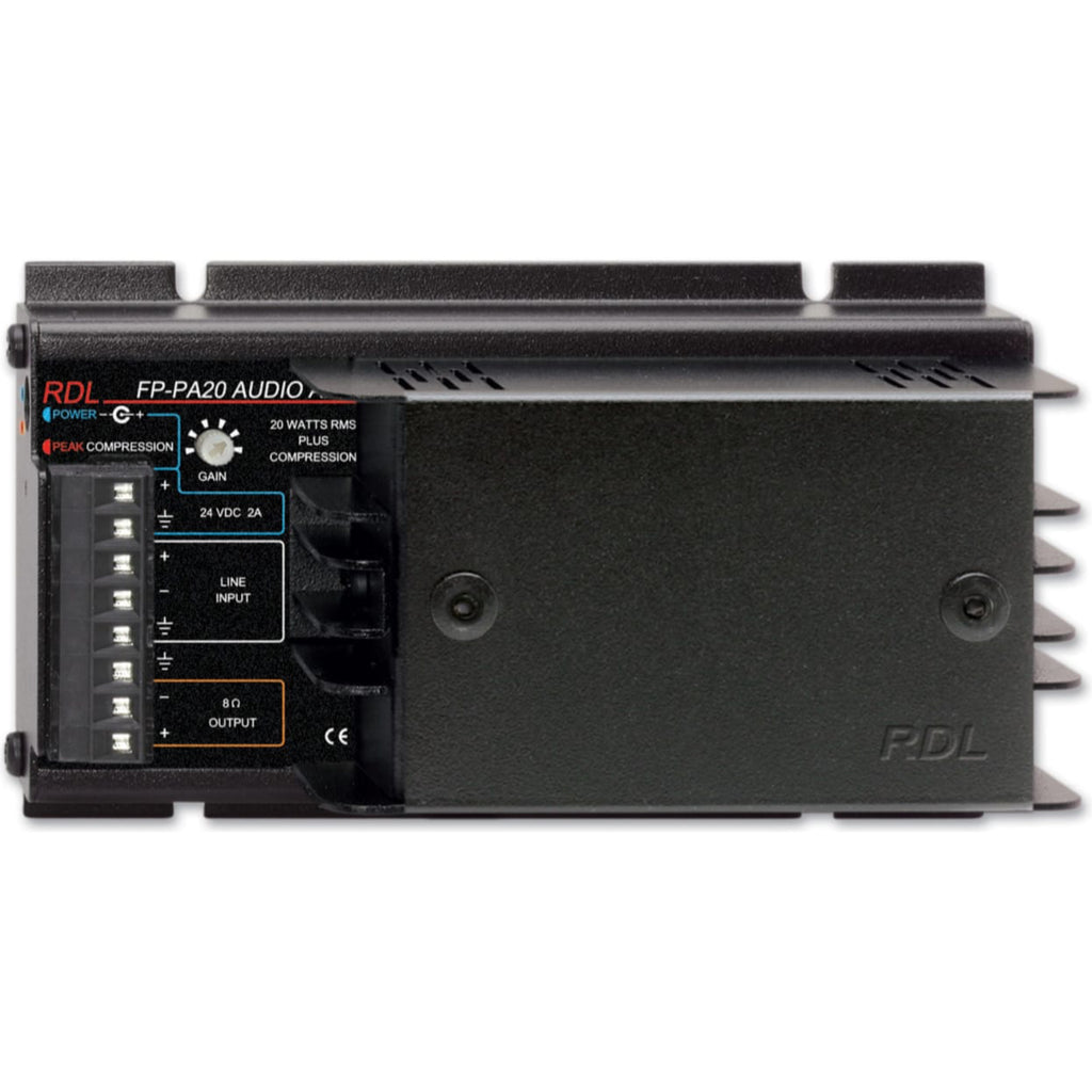 The FP-PA20 features a balanced line level input that may be connected unbalanced. A front panel gain control is designed to be adjusted either manually or with a trimming screwdriver. The gain range will accommodate standard unbalanced levels as well as professional balanced levels. The output will drive an 8 Ω speaker or multiple speakers connected to present an 8 Ω load to the amplifier. Audio levels that could cause the amplified output to clip are compressed using two dynamic time constants designed to preserve aural transparency. Normal audio level signals remain unaffected by the compressor thereby preserving audio dynamics and preventing the compressor from increasing feedback potential when the amplifier is used for paging. The FP-PA20 produces average audio levels and audio clarity normally expected of amplifiers delivering much higher output power.