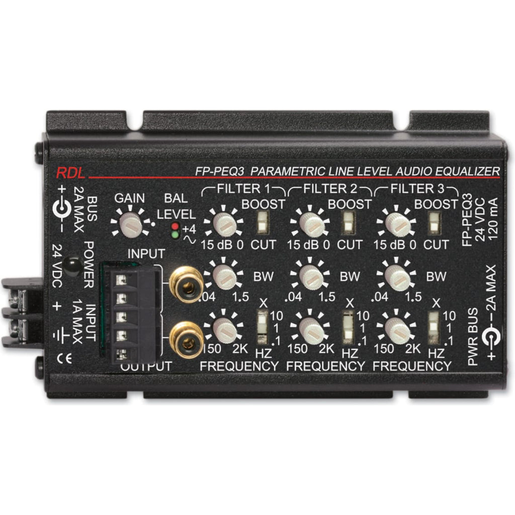 The FP-PEQ3 is the ideal choice in many applications where parametric equalization or acoustic notch filtering is needed. The FP-PEQ3 is a single-channel module featuring three identical independent filters. Each filter has separately adjustable FREQUENCY, BOOST/CUT amplitude, and bandwidth (BW) parameters. The FREQUENCY has three fully overlapping switch-selectable ranges: 15 Hz to 200 Hz, 150 Hz to 2 kHz, 1.5 kHz to 20 kHz. The BOOST/CUT provides a +/-15 dB range, switch-selectable to produce either cut or boost, making acoustic adjustment easier than with other parametric equalizers. Setting a given filter's BOOST/CUT to minimum completely removes that filter from the circuit. The bandwidth (BW) allows adjustment from 0.04 octave to 1.5 octave.