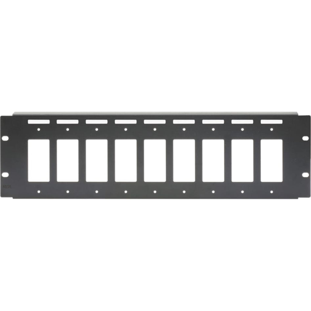 The RM-D9 is a 3 RU rack panel that allows the mounting of 9 Decora products, such as RDL remote controls and D-Series connector plates. The installer can label each installed module behind an included protection lens.
