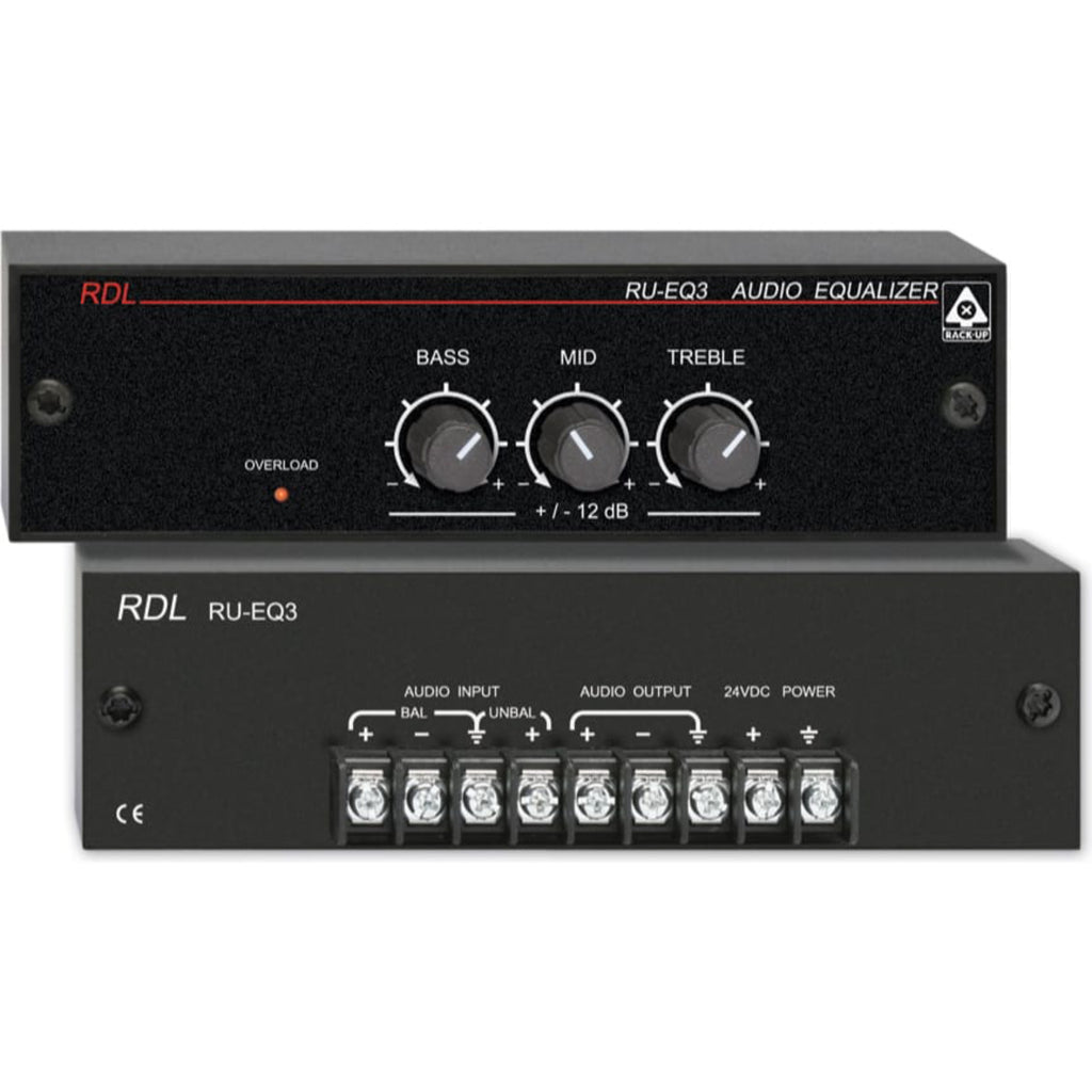 The RU-EQ3 features a balanced bridging input, which may be connected unbalanced if desired. The output driver is 150 Ω balanced, and is intended to drive unbalanced or balanced lines of 150 Ω or higher impedance. Front-panel knobs provide active equalization, each controlling a separate audio band. These bands were carefully selected to yield a module that works effectively in a wide variety of systems. Each band's center frequency can be either boosted or attenuated by at least 12 dB. The Q of the low and high band equalizers was selected so that those controls can be functionally considered as a total bass band or treble band control. The RU-EQ3 adds a third control. This midrange control is optimized to voice band adjustment, with the overlap tailored to provide smooth operation for wideband music applications. The RU-EQ3's OVERLOAD indicator flashes if either the input or output stage clips.