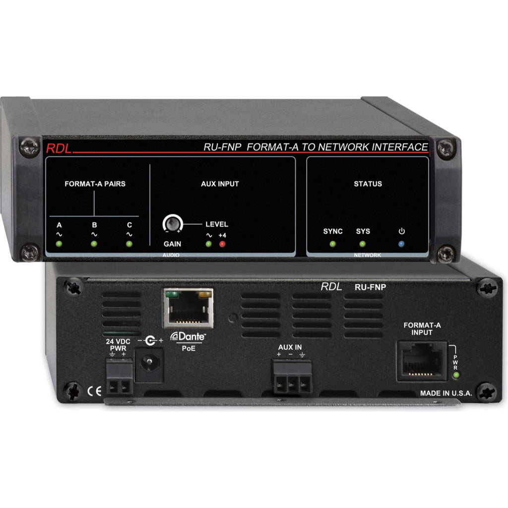 APPLICATION: The RU-FN is an RDL Format-A receiver that connects to a Dante-enabled network. It converts the three Format-A audio pairs to Dante networked digital audio channels. Each network channel corresponds to Pair A, B or C of the Format-A input. The unit converts a fourth input, balanced or unbalanced line-level AUX, to Dante.
