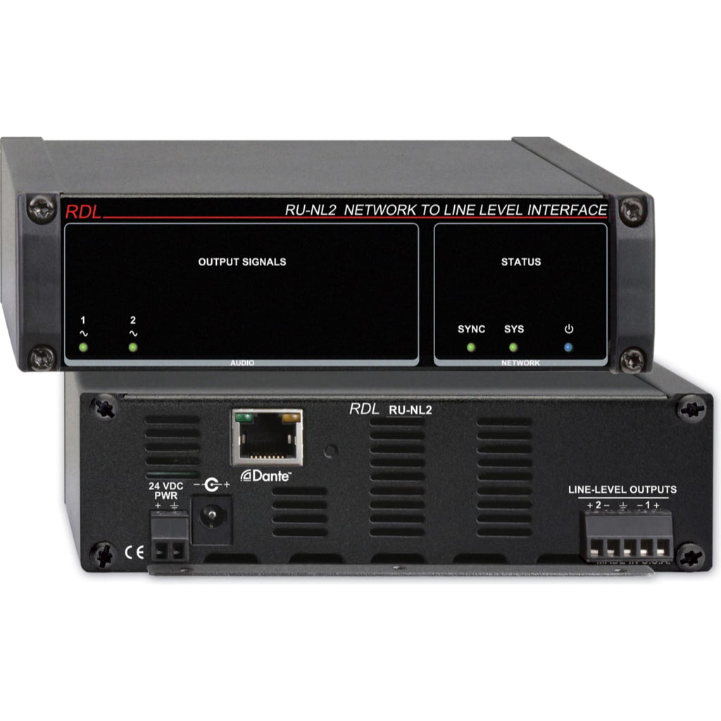 APPLICATION: The RU-NL2 is a high quality converter that provides professional line-level outputs from two Dante network audio channels. Each output provides +4 dBu balanced for a network digital audio level of -18 dBFS. The professional output directly interfaces with other professional and commercial equipment without the need for additional gain. Crosstalk is below the noise floor between all outputs across the entire audio spectrum. The noise floor is better than 80 dB below operating level with greater than 18 dB of headroom.