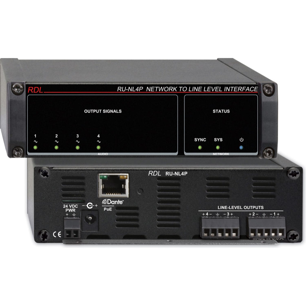 APPLICATION: The RU-NL4 is a high quality converter that provides professional line-level outputs from four Dante network audio channels. Each output provides +4 dBu balanced for a network digital audio level of -18 dBFS. The professional output directly interfaces with other professional and commercial equipment without the need for additional gain. Crosstalk is below the noise floor between all outputs across the entire audio spectrum. The noise floor is better than 80 dB below operating level with greater than 18 dB of headroom.
