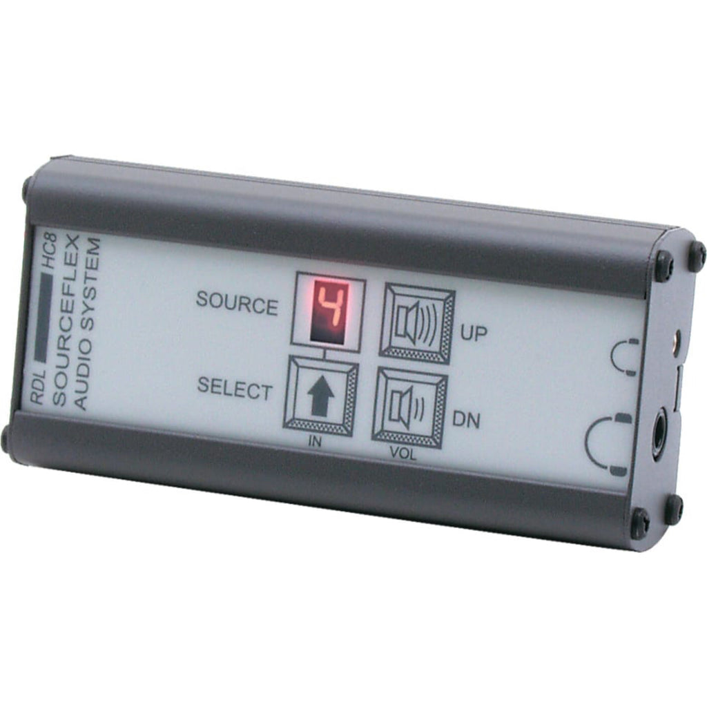 The SAS-HC8 Headphone Control Station is a SourceFlex headphone listening station for use with exercise equipment or on a tabletop. Each unit features a source selector with numeric indicator and volume adjustment buttons. Sealed touch controls protect the internal circuitry from debris and moisture. The rugged metal case is both attractive and durable. If headphones are left unplugged from the SAS-HC8, the internal processor resets the volume to a safe listening level. This averts the possibility of a loud, potentially harmful audio burst when headphones are plugged in.