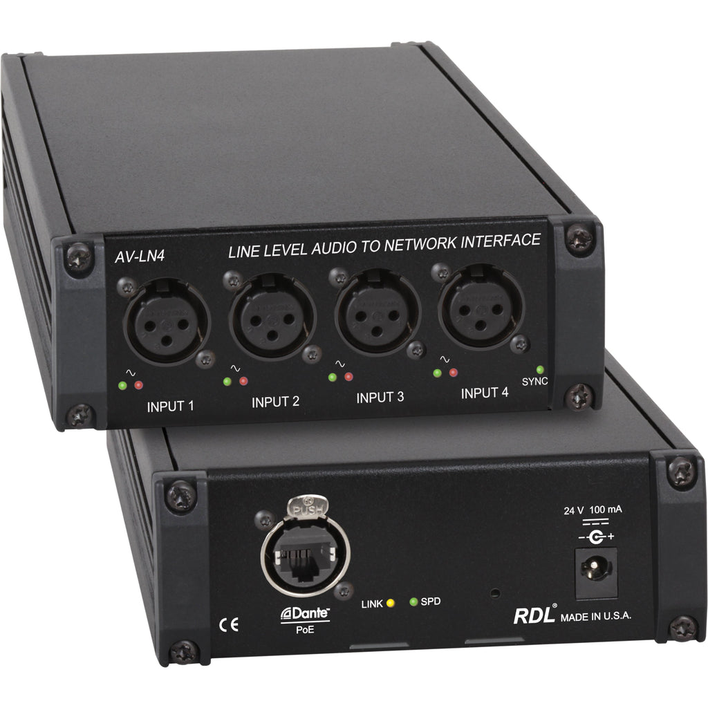 The AV-LN4 is an interface that converts four line-level XLR inputs to Dante network audio channels. Special software is not required to configure the AV-LN4. A dual-LED VU meter displays the level for each. The AV-LN4 is a professional grade product for studio quality fidelity and low noise performance.