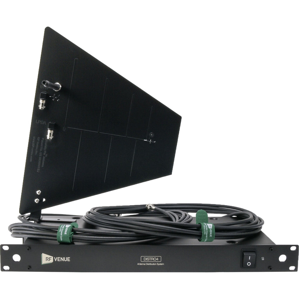 (1) Diversity Fin Antenna Wallmount Black (DFINB) for Wireless Microphones, (1) DISTRO4 Antenna Distribution System, (2) RG8X25 Coaxial Cables BNC