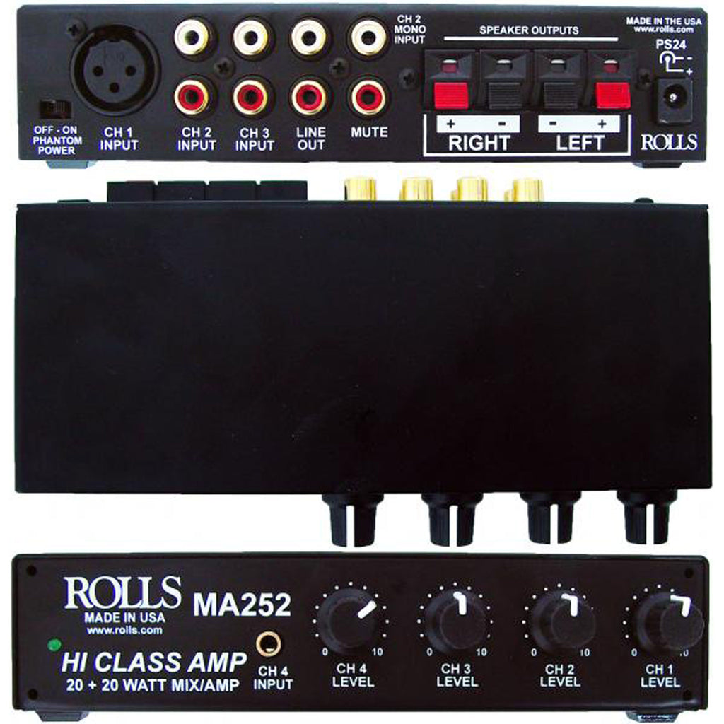 The new MA252 is a compact class D stereo amplifier with a 4 CH. stereo mixer built in. It has 20 watts per channel @ 4 Ohms. The class D low heat design gives the MA252 the ability to be mounted in very tight applications. It will work great in ceilings by projectors, or anywhere small and heat free amplification is required. The MA252 is in an all metal chassis and weighs 1 pound. Overall dimension are 6.75" X 3.5" X 1.5". Bottom mounts are provided for permanent installations. The MA252 has an included 24 VDC external power supply. The 4 channel mixer section consists of 2 separate RCA stereo inputs, along with an XLR mic input and a 3.5mm (1/8") stereo input perfect for an ipod or laptop computer type input. Phantom power is supplied to the XLR input by a switch on the back of the MA252.