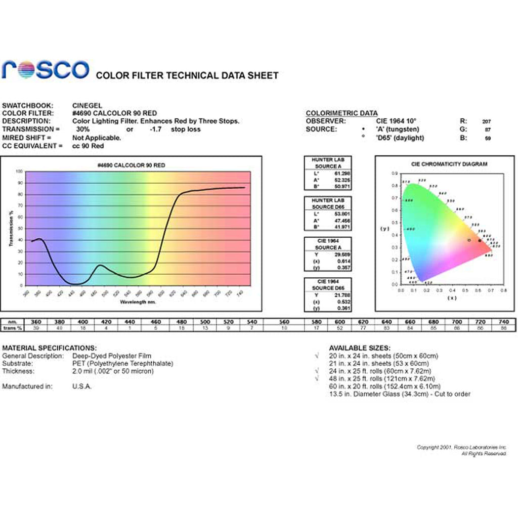 All of the filters in the Cinegel range are available in 20"x24" sheets and 48"x25' rolls, unless otherwise noted. The Cinegel range of color correction and color effects filters are manufactured using deep-dyed polyester for heat stability & superior color transmission.