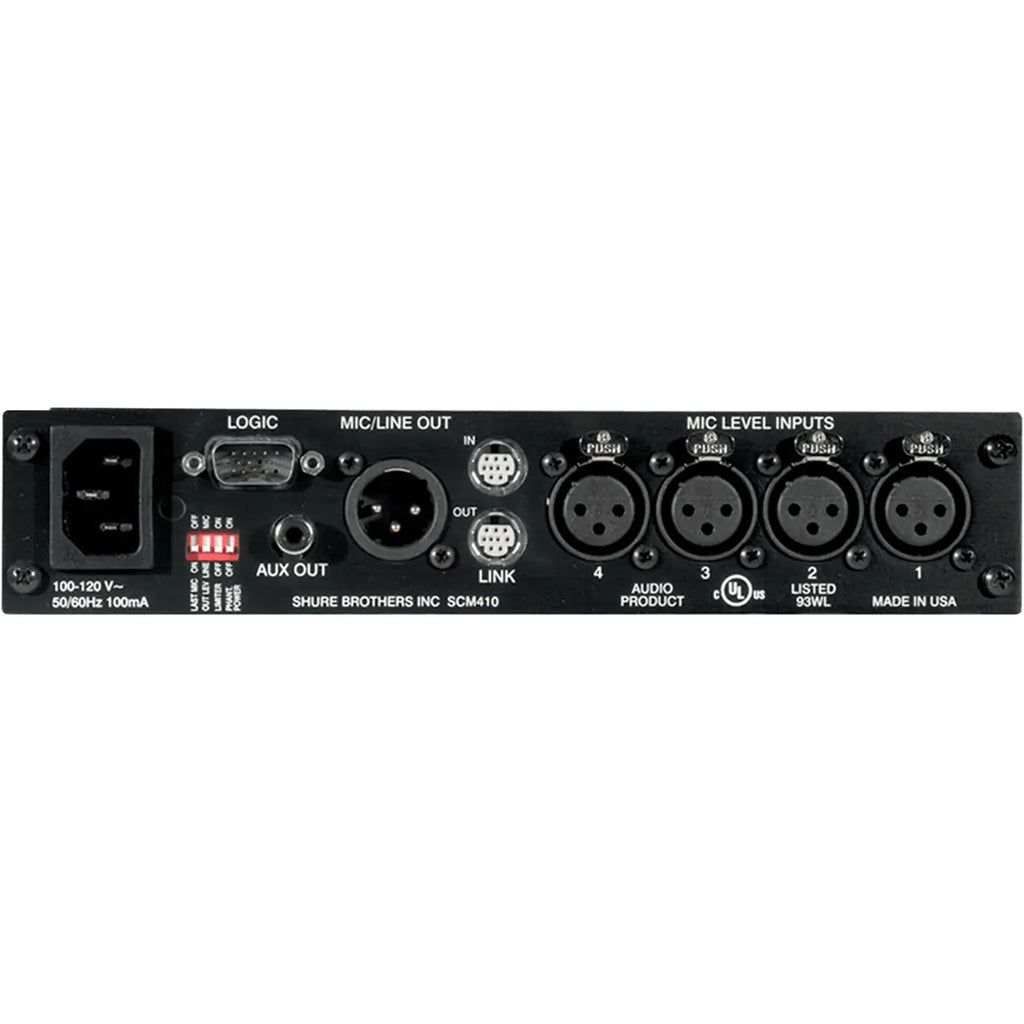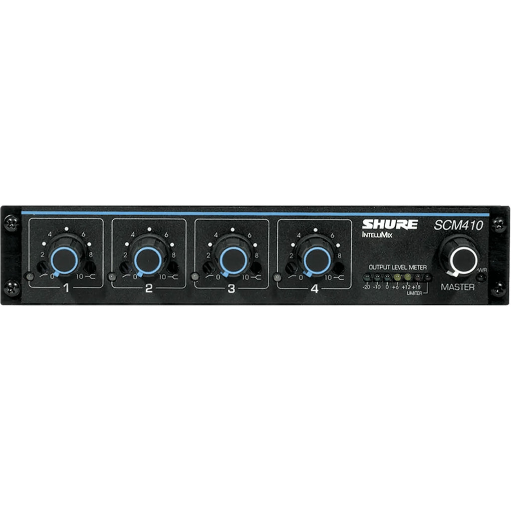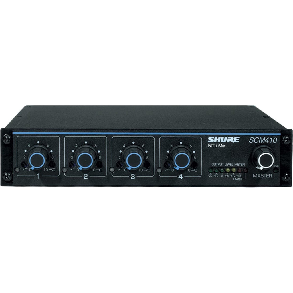 Automatic mixing is a tremendous problem-solving tool allowing sound system installers to eliminate common problems such as insufficient gain before feedback and muddy speech quality. Shure is the industry leader in automatic mixing with our unique IntelliMix technology. IntelliMix automatically gates microphones on and off to optimize sound quality in conference facilities, houses of worship, governmental institutions, schools, etc. The Shure SCM410 Automatic Mixer puts all the seamless performance of the 8-channel SCM810 - the recognized standard in automatic mixing - into a half-rack space.