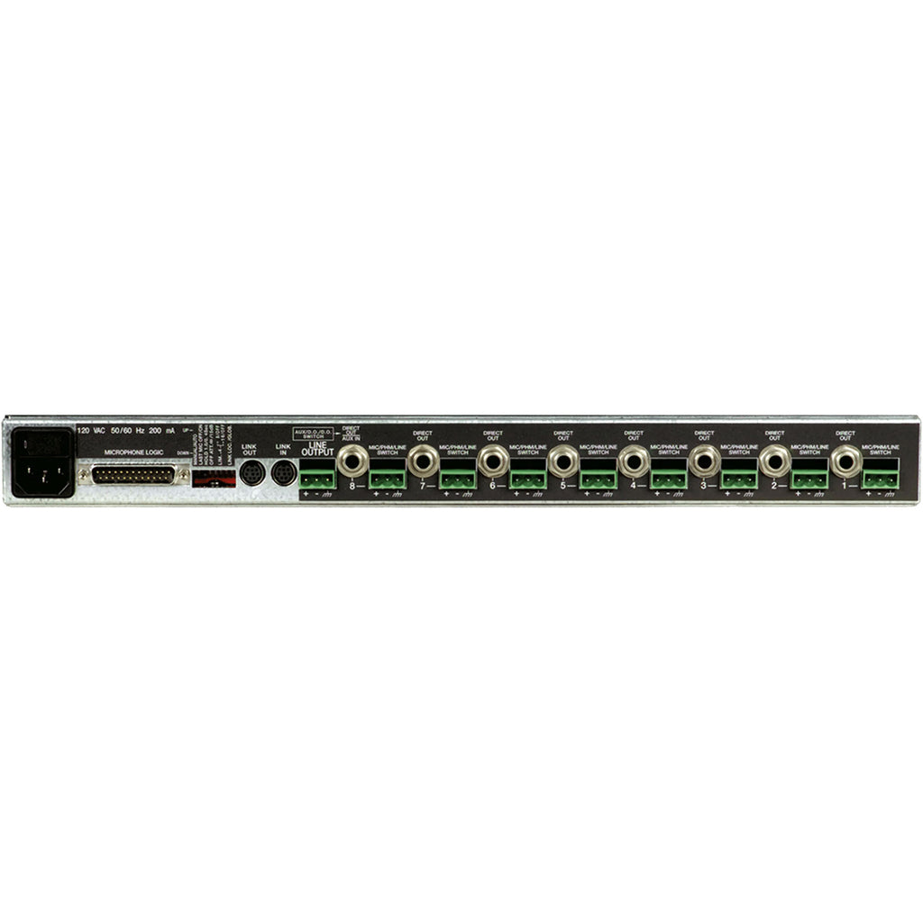 Features include adjustable EQ per channel, 48 V phantom power, active balanced microphone - or line-level inputs, line-level outputs, highly RF resistant chassis and circuitry, complete logic control of microphone activation, linking capacity for up to 400 microphones, with an internal power supply. 120/230 Vac power.