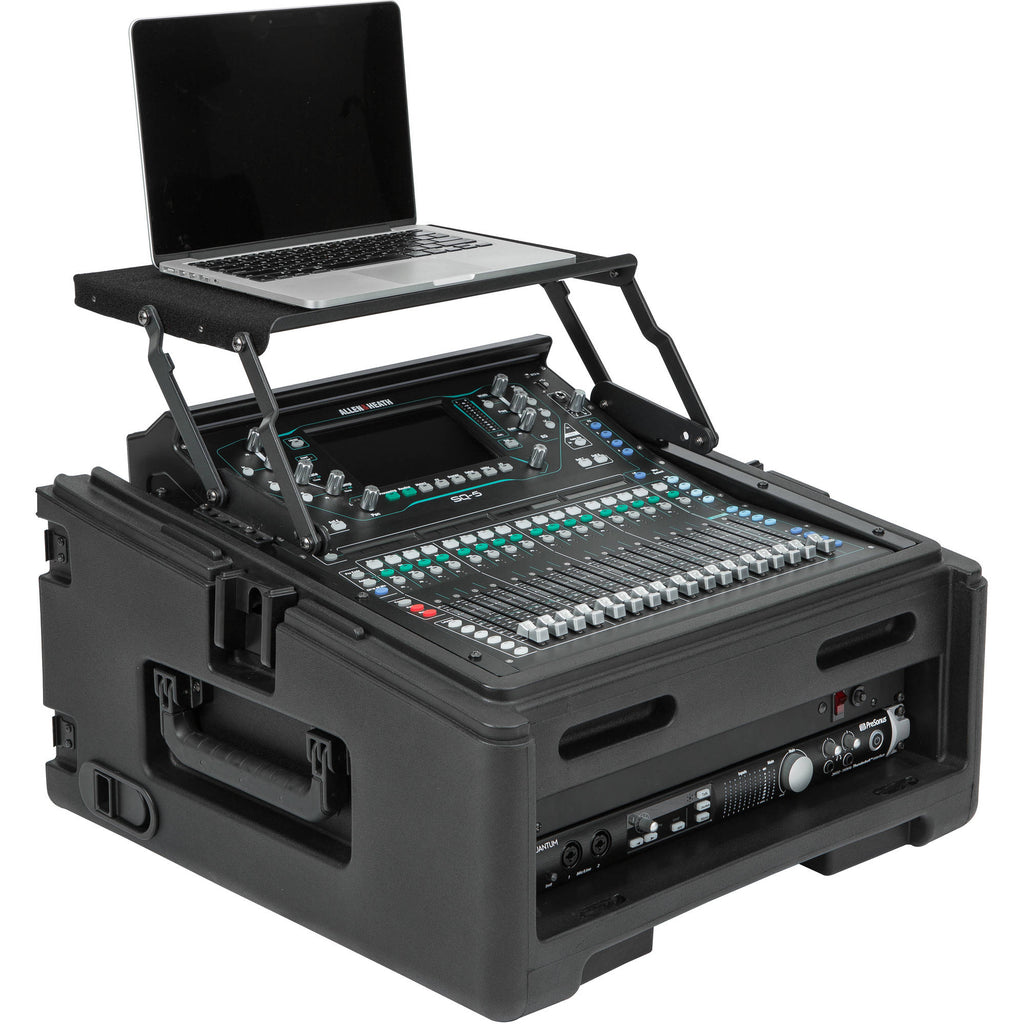 - 10U, 7-degree angled top threaded steel rails for secure mounting of popular mixers/DJ controllers