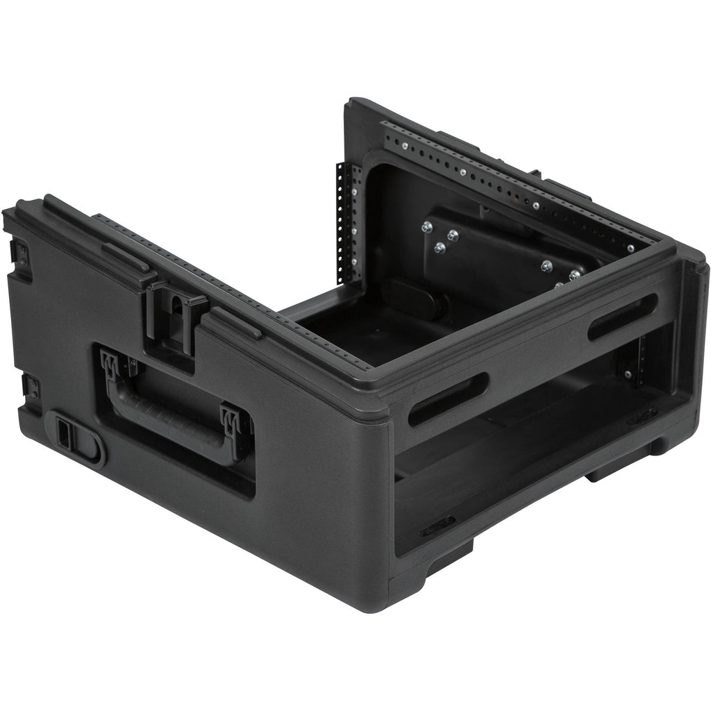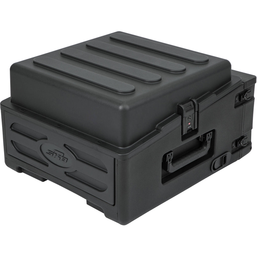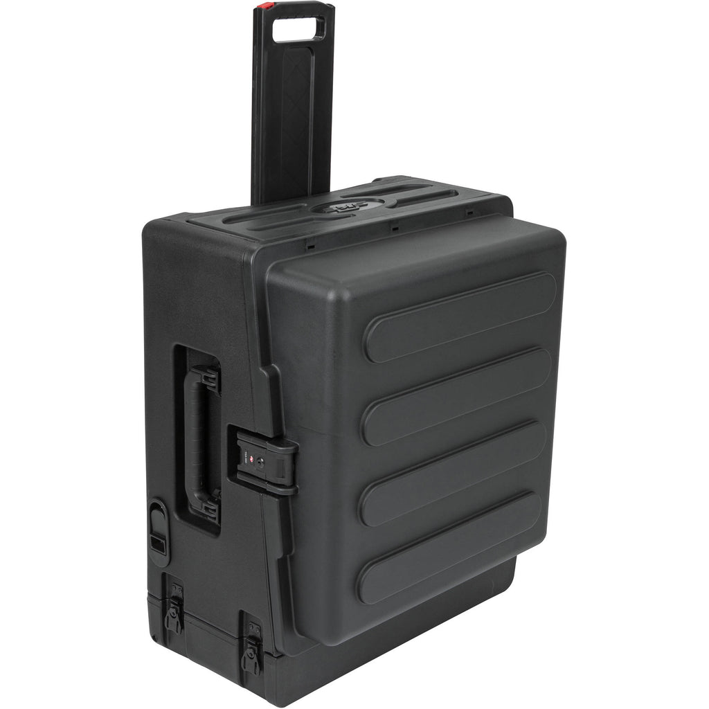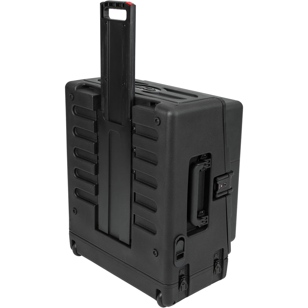 Our all-new 1SKB-R102W Rolling Compact Rig features a standard 10U top and 2U front and rear rack rails. It also includes a new one-touch pull handle and back lid mounted wheels for easy transport, as well as a redesigned exterior that allows this new Rig to easily stack with existing standard Roto-Racks and the recently updated Roto Rolling Racks. Featuring an injection-molded top, the new Rolling Compact Rig also comes standard with TSA-accessible locking latches that secure the lid to the top of the rig.