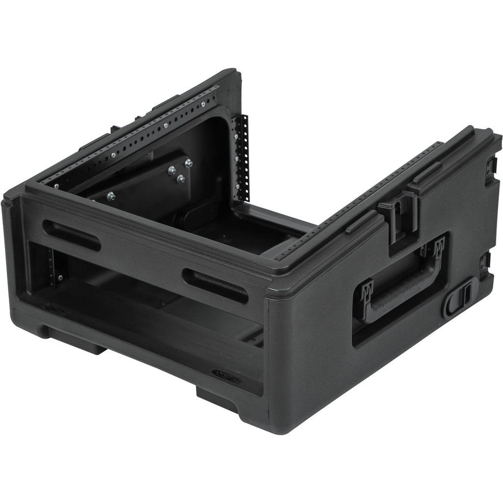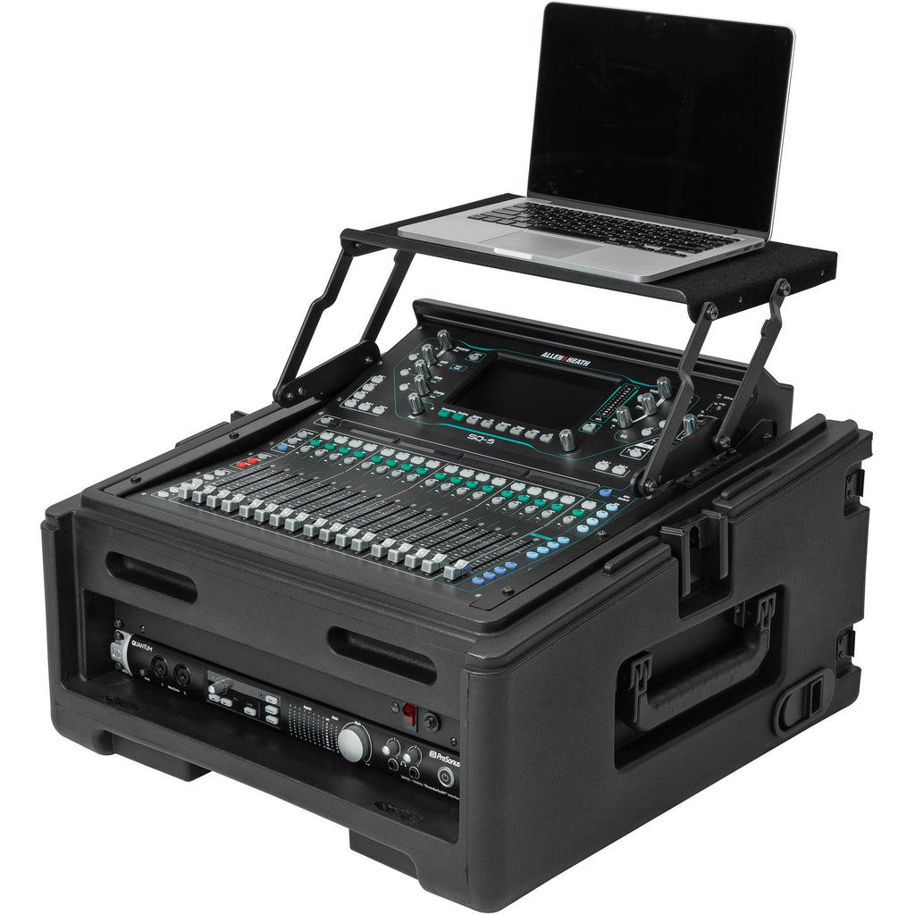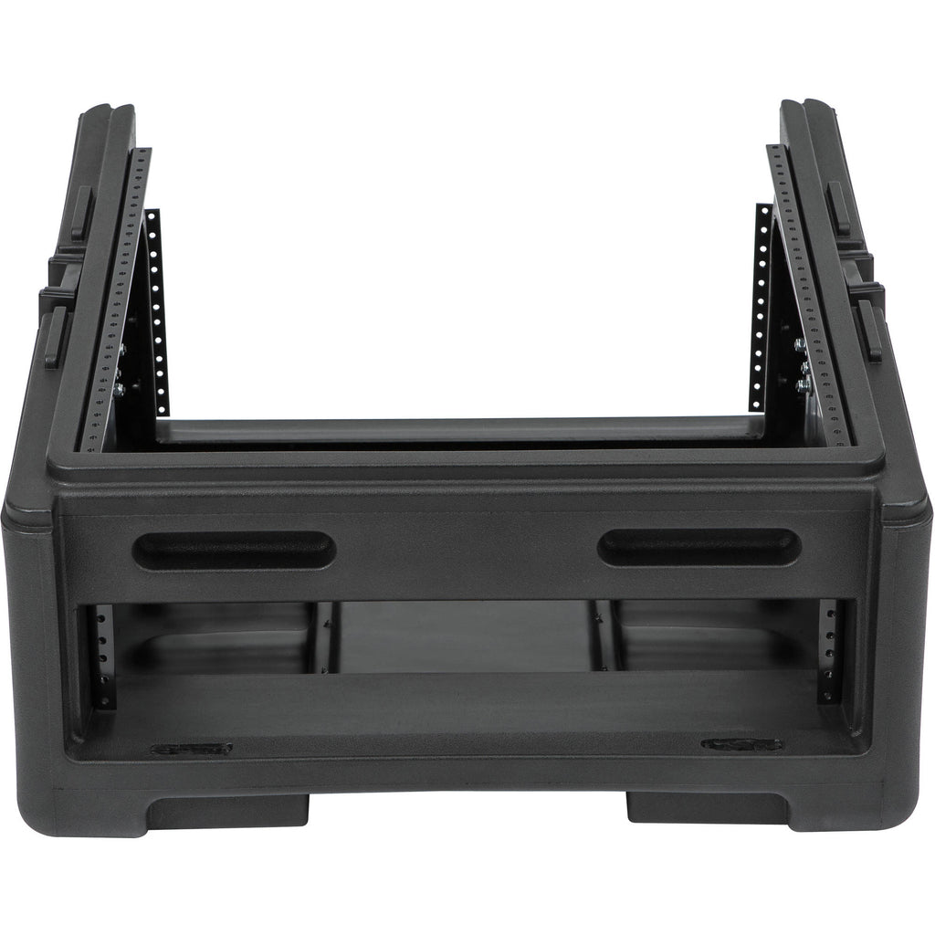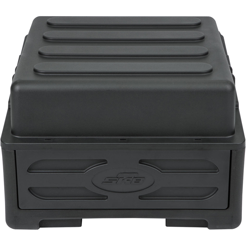 Our all-new 1SKB-R102W Rolling Compact Rig features a standard 10U top and 2U front and rear rack rails. It also includes a new one-touch pull handle and back lid mounted wheels for easy transport, as well as a redesigned exterior that allows this new Rig to easily stack with existing standard Roto-Racks and the recently updated Roto Rolling Racks. Featuring an injection-molded top, the new Rolling Compact Rig also comes standard with TSA-accessible locking latches that secure the lid to the top of the rig.