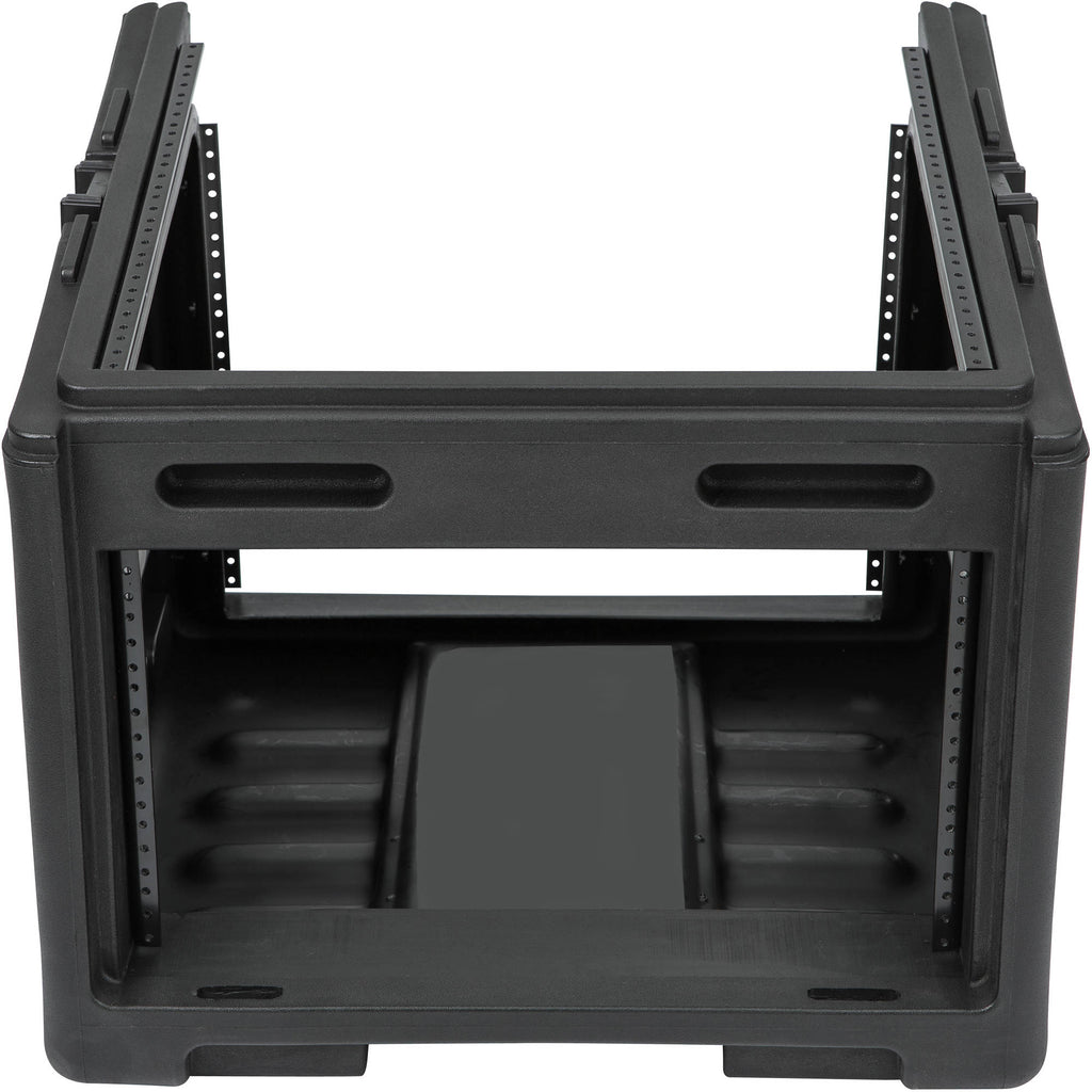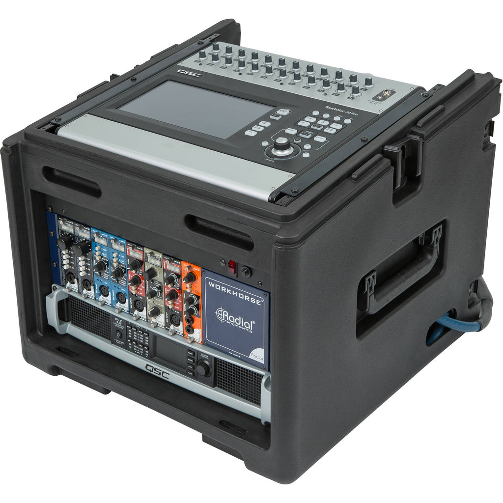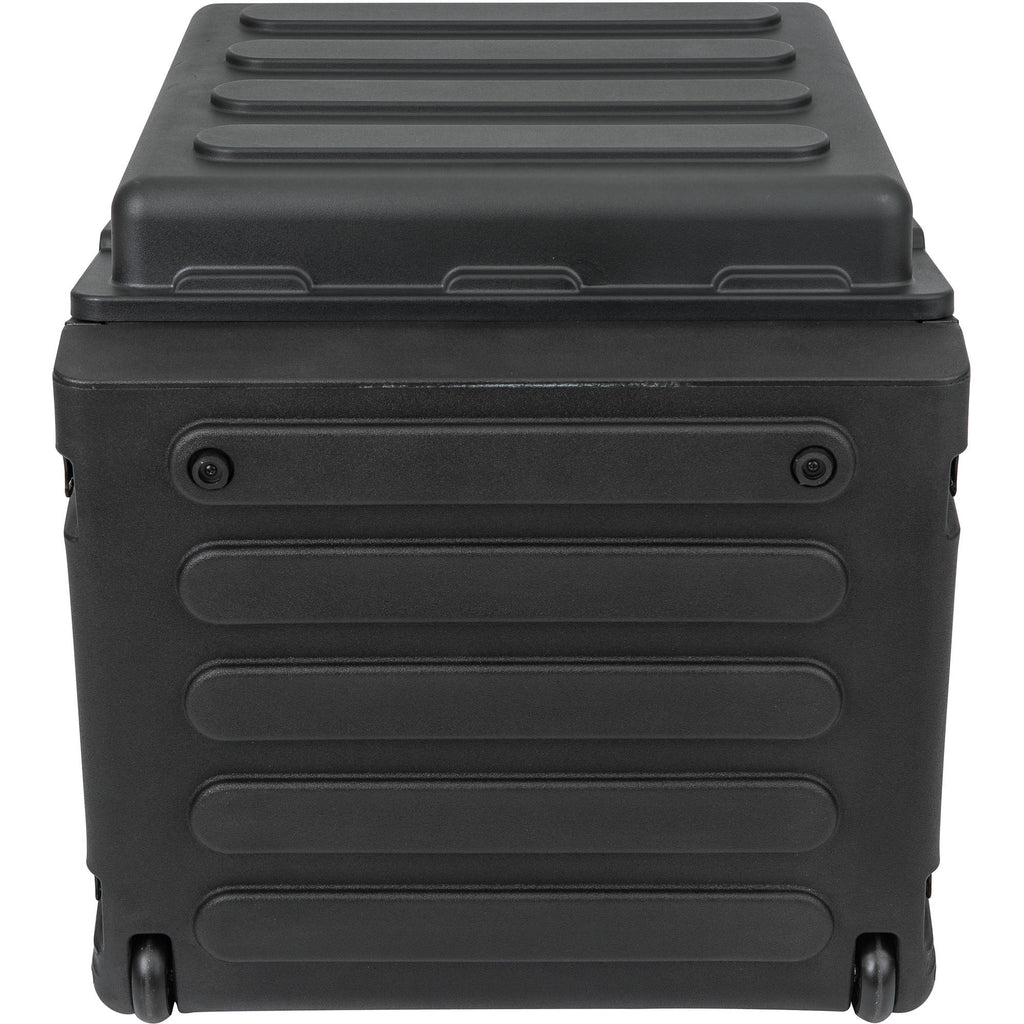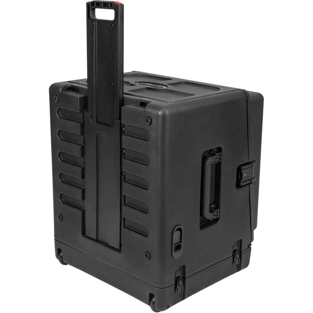 Our all-new 1SKB-R106W Rolling Compact Rig features a standard 10U top and 6U front and rear rack rails. It also includes a new one-touch pull handle and back lid mounted wheels for easy transport, as well as a redesigned exterior that allows this new Rig to easily stack with existing standard Roto-Racks and the recently updated Roto Rolling Racks. Featuring an injection-molded top, the new Rolling Compact Rig also comes standard with TSA-accessible locking latches that secure the lid to the top of the rig.