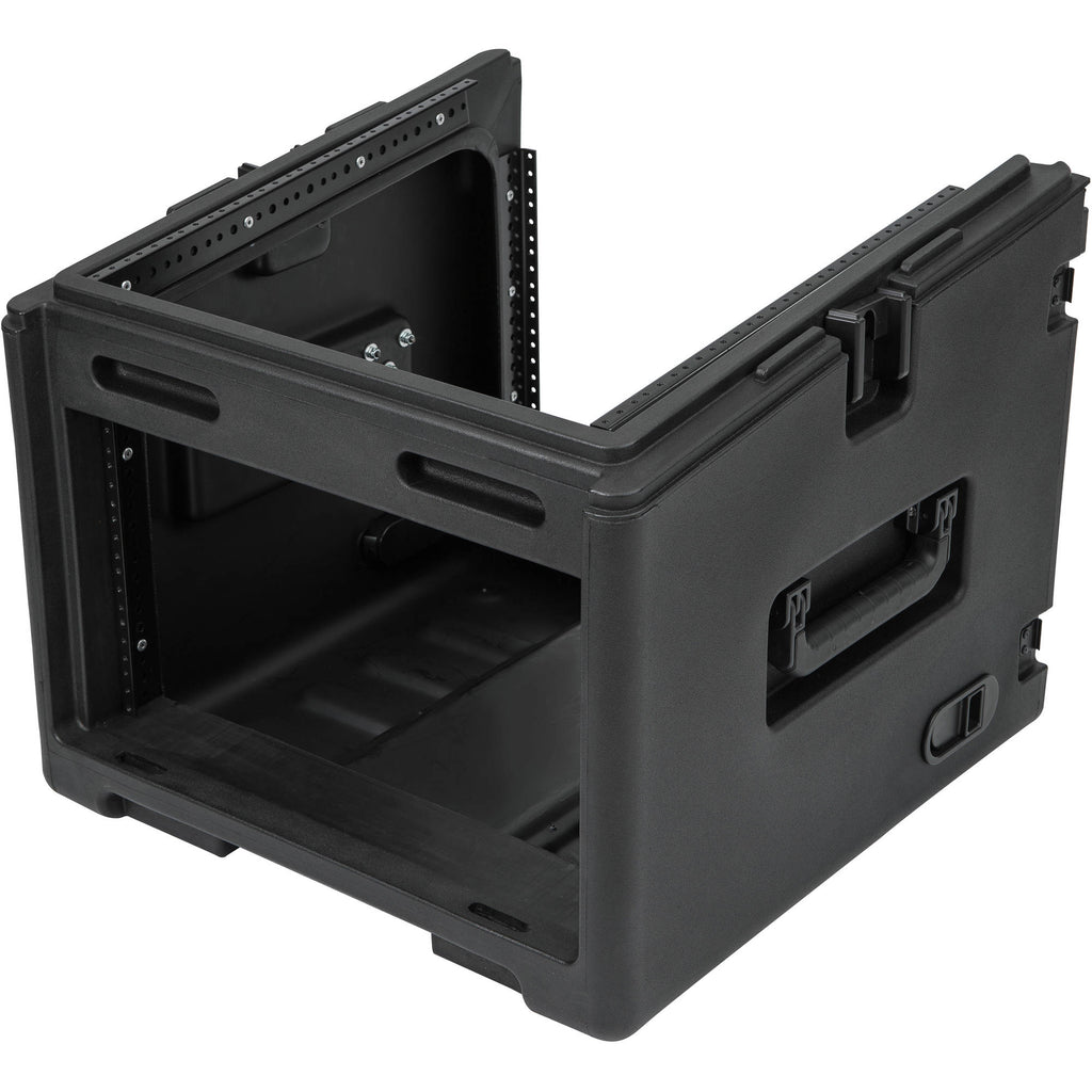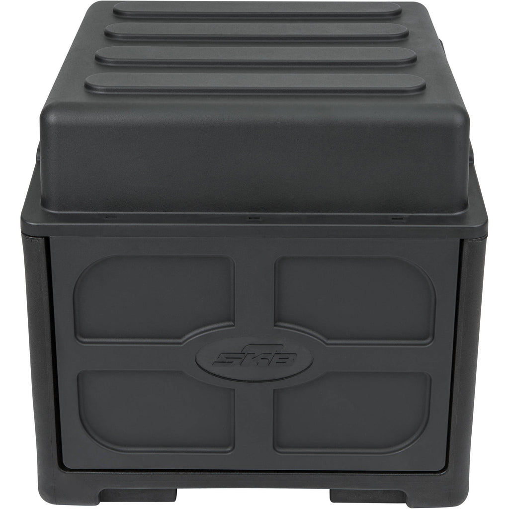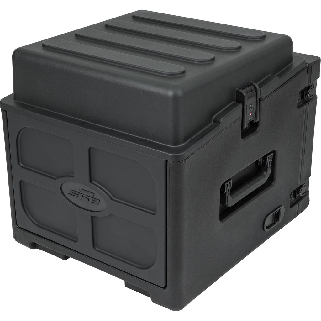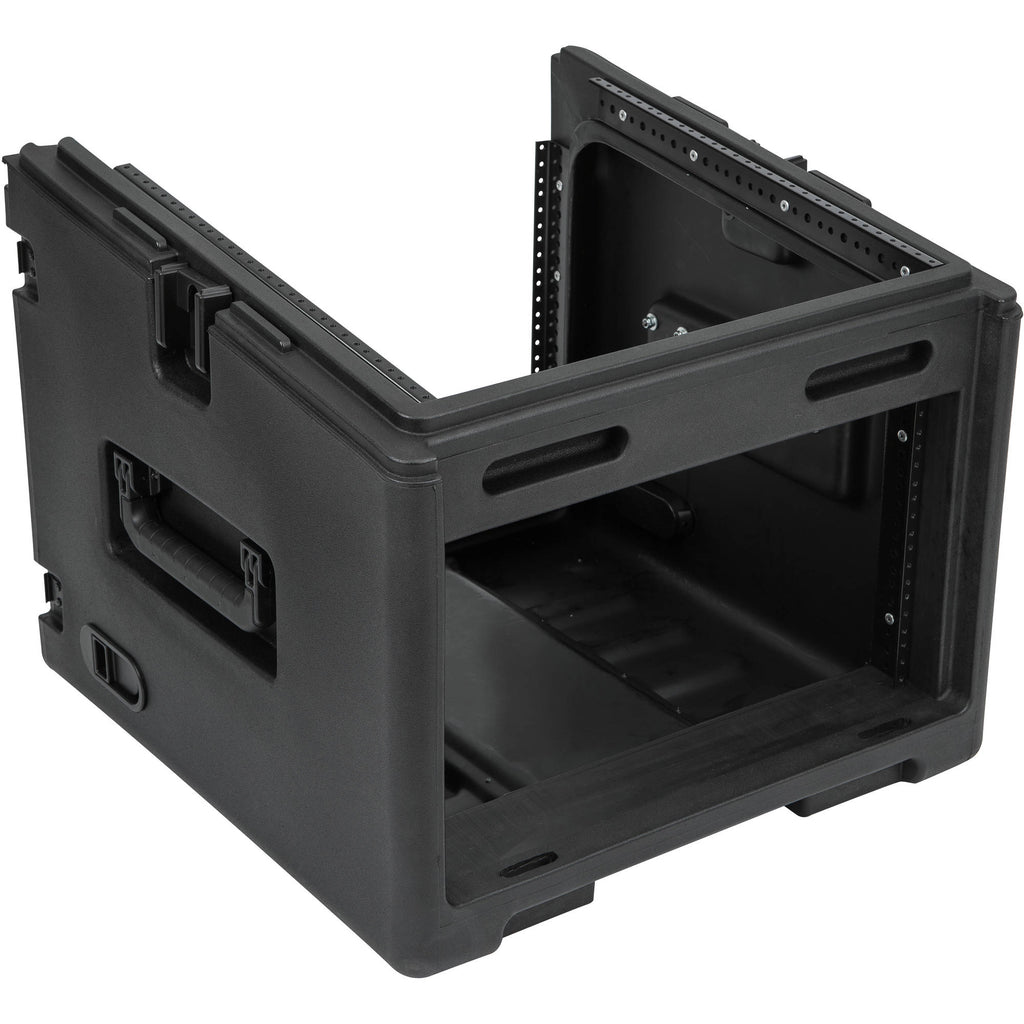 Our all-new 1SKB-R106W Rolling Compact Rig features a standard 10U top and 6U front and rear rack rails. It also includes a new one-touch pull handle and back lid mounted wheels for easy transport, as well as a redesigned exterior that allows this new Rig to easily stack with existing standard Roto-Racks and the recently updated Roto Rolling Racks. Featuring an injection-molded top, the new Rolling Compact Rig also comes standard with TSA-accessible locking latches that secure the lid to the top of the rig.