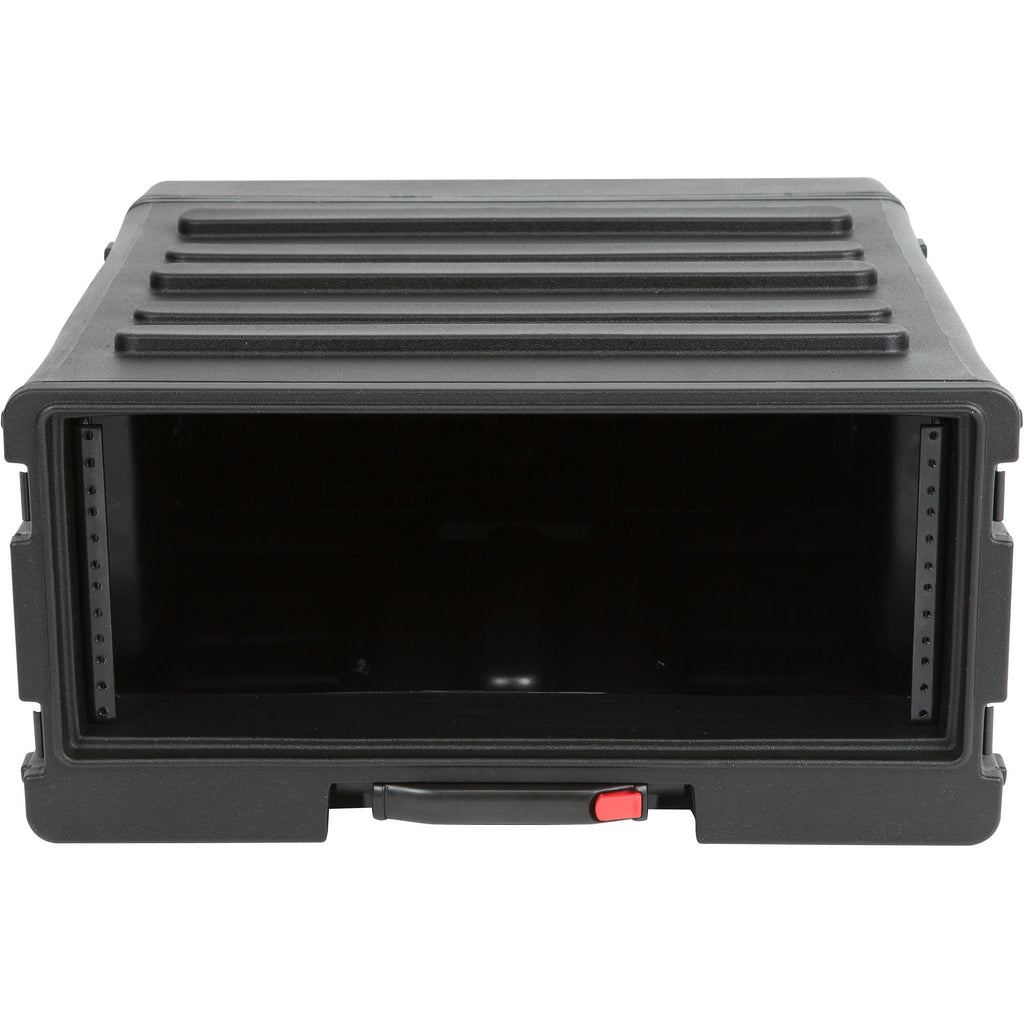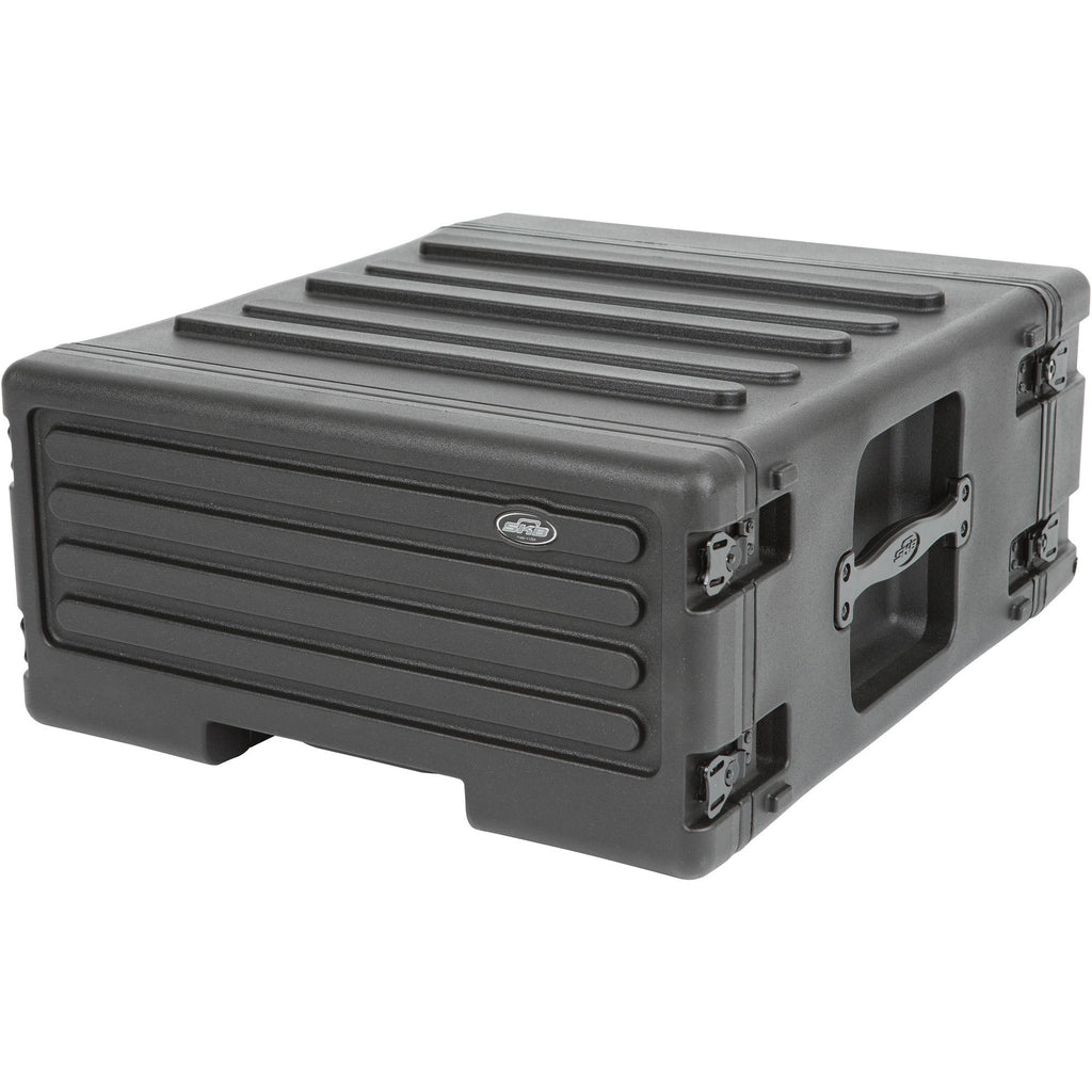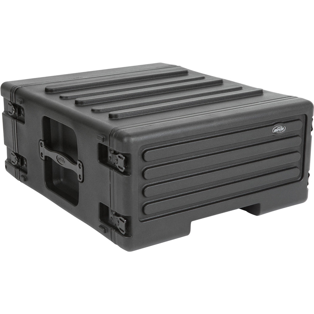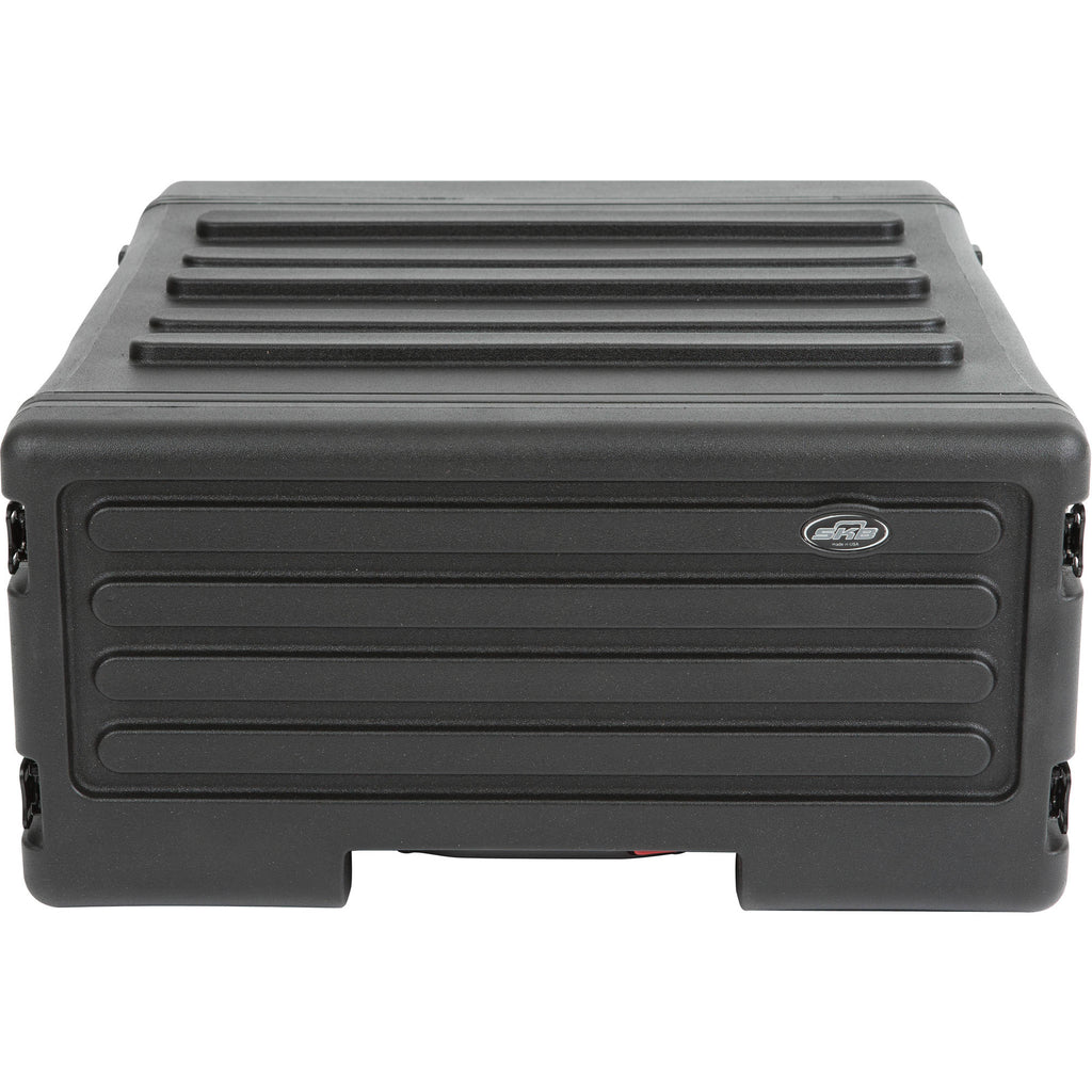 The SKB 4U Roto Rolling Rack Case is designed to house rack-mountable equipment for musicians and audio engineers in studios, live stage applications, and mobile-recording setups. It features threaded steel rails in the front and back and a waterproof gasket to keep your gear dry. The rear access door allows easy configuration of your equipment's rear-panel connectors and switches. Military-grade butterfly latches provide dependable and secure closure.