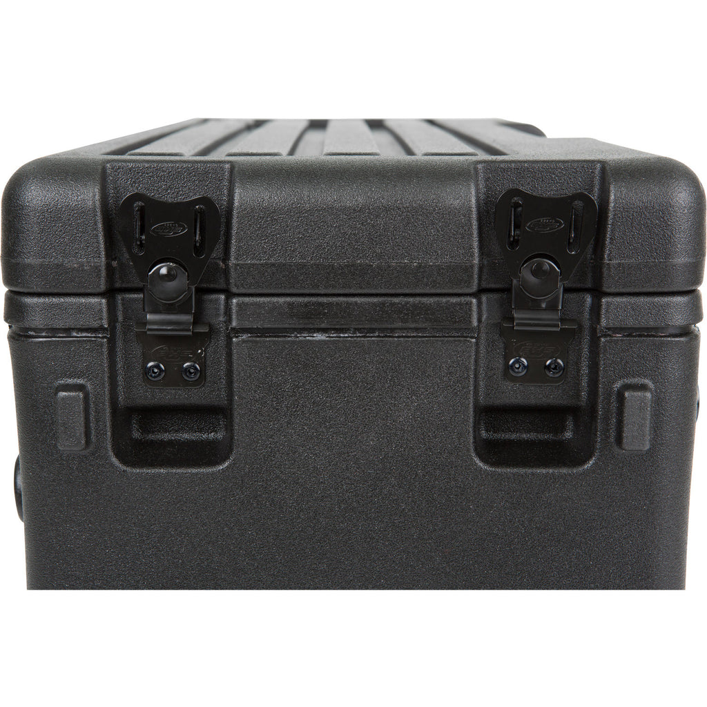 A one-touch pull handle, low-profile carry handles, and back-lid-mounted rolling wheels deliver versatile and effective transport methods. The case's slotted design enables easy stacking with SKB standard and shallow racks.