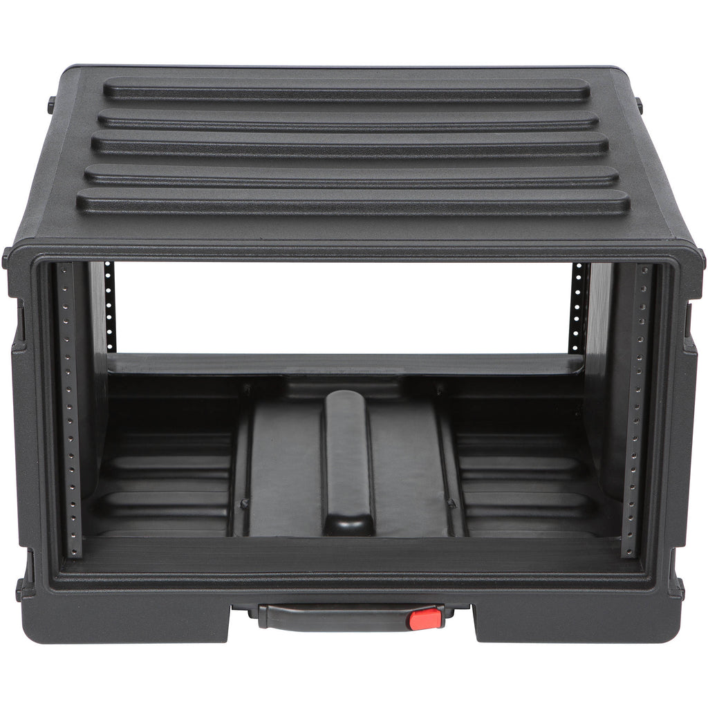 A one-touch pull handle, low-profile carry handles, and back-lid-mounted rolling wheels deliver versatile and effective transport methods. The case's slotted design enables easy stacking with SKB standard and shallow racks.