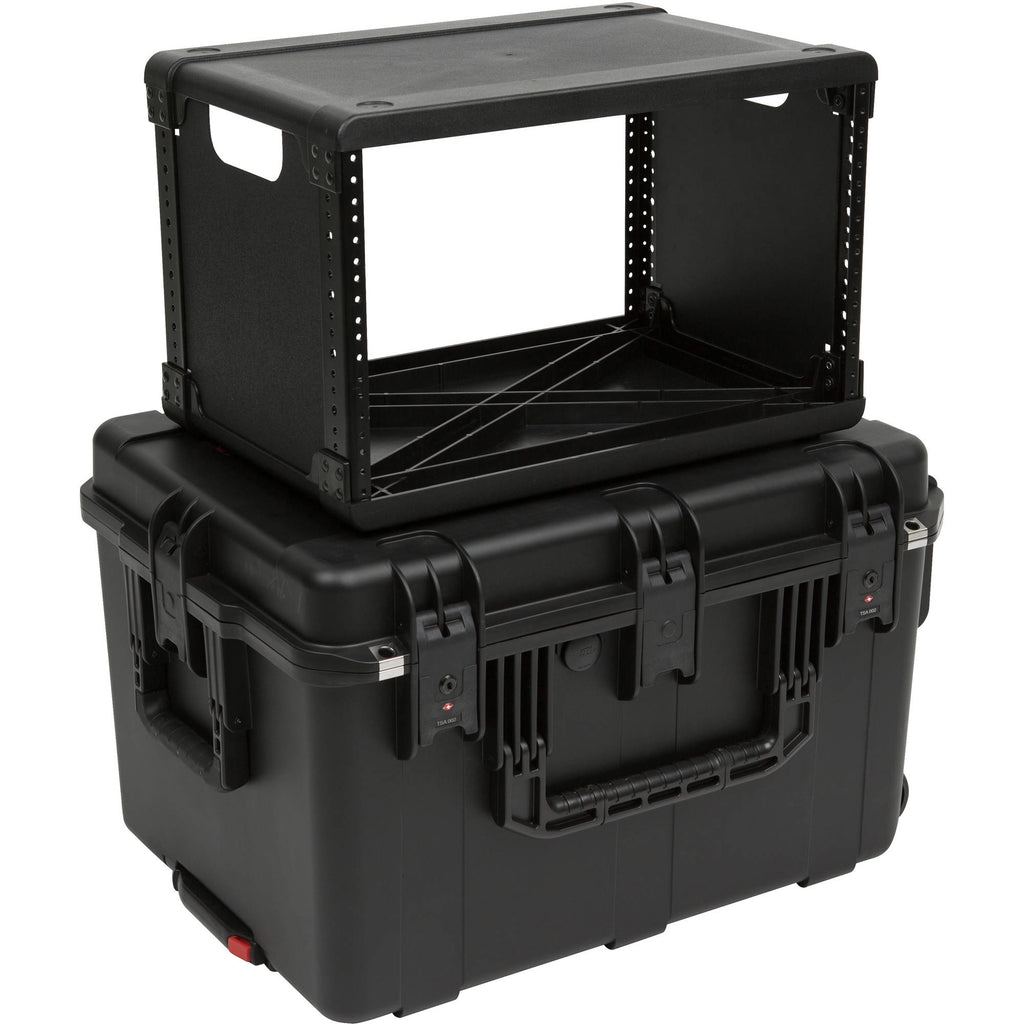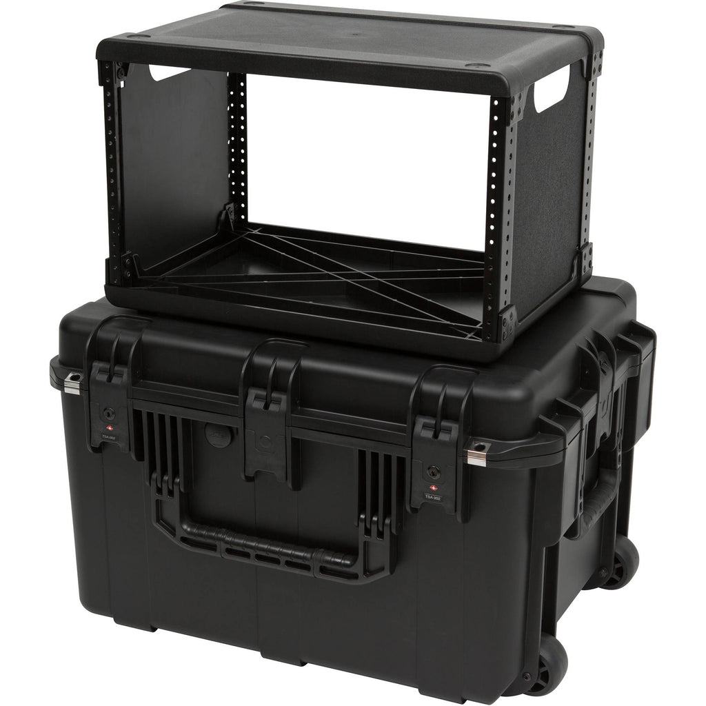 The 6 RU SKB iSeries Injection-Molded 13" Fly Rack is a rolling flight- and shipping-friendly rack case designed to house rack-mountable equipment for musicians and audio engineers on tour and in studios, live stage applications, and mobile-recording setups. It features threaded rails in the front and back with a 13" rail-to-rail depth. TSA-compliant, trigger-release latches provide dependable closure and can be secured with a padlock (available separately).