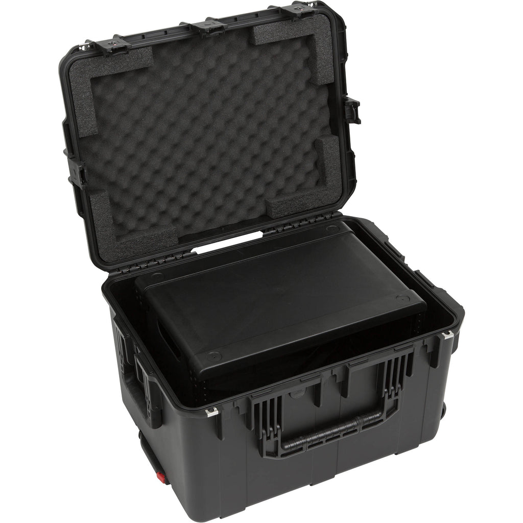 The polypropylene copolymer resin case is strong, waterproof, and resistant to dirt, dust, corrosion, and more. Its automatic pressure-equalization valve prevents damage caused by drastic changes in air pressure. The molded-in hinges contribute to the case's sleek appearance and add additional protection. A one-touch pull handle, molded cushion-grip carry handles, and in-line rolling wheels deliver versatile and effective transport methods.