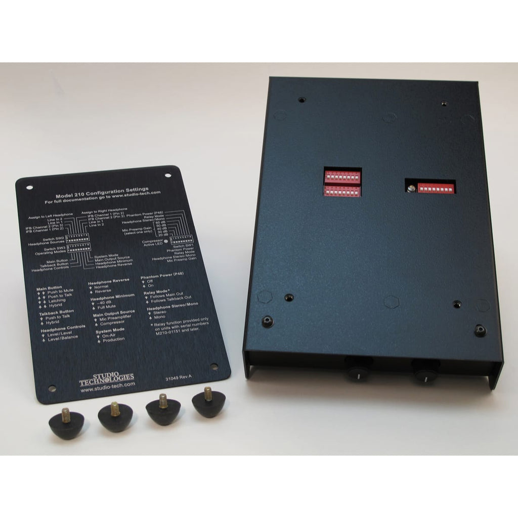 Model 210 configurations are made using DIP-type switches that are accessible via the bottom of the enclosure. No disassembly is required. An included security panel attaches to the bottom of the enclosure to limit access.