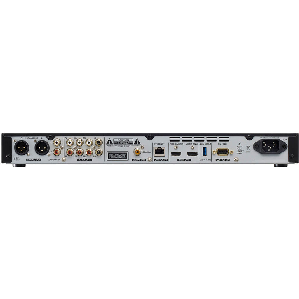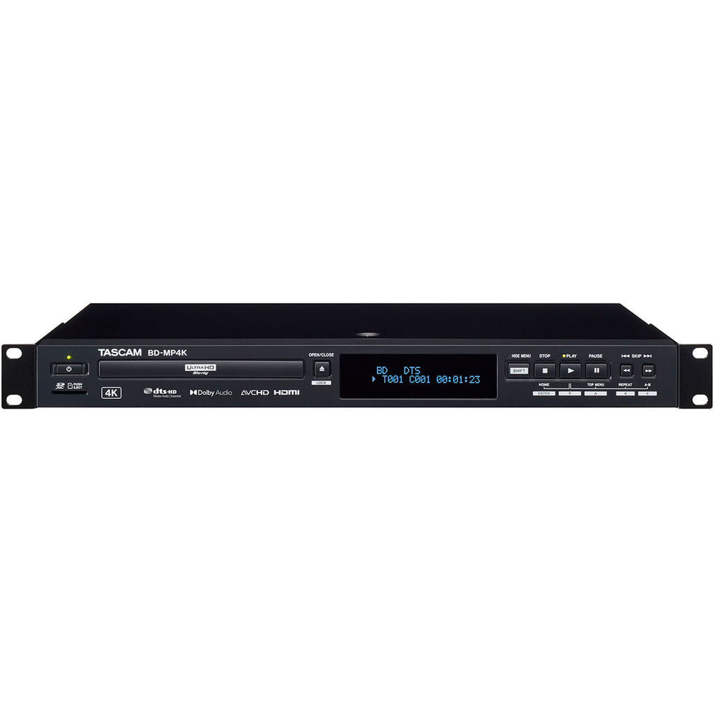 1U rack mount 4K UHD Blu-ray/DVD/CD/SD/USB multi-media player with external remote control support.