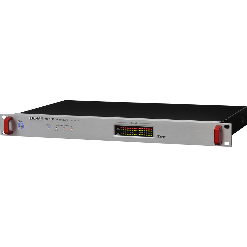 The TASCAM ML-16D is a professional Dante-focused converter made specifically to insert or extract analog audio into or out of a Dante (Digital Audio Network Through Ethernet) network using external breakout devices that utilize Sub-D format connectors.