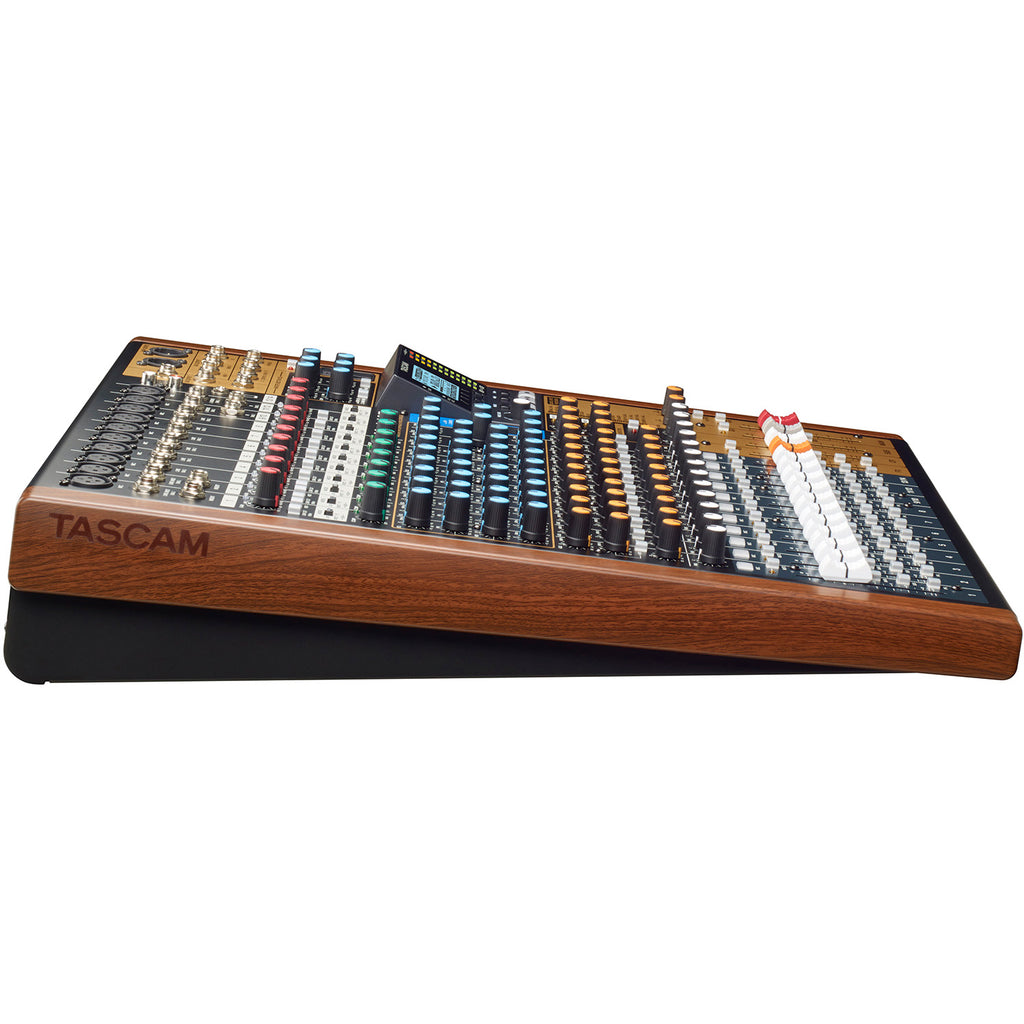 An internal 16 input/14 output USB audio interface captures audio at a 24-bit/48 kHz sampling rate for recording or playing back from an external DAW (digital audio workstation). The new generation TASCAM USB driver delivers the minimum size of the audio buffer which can be set to as low as 4 samples, resulting in extremely low latency and the highest level of efficiency when recording audio.