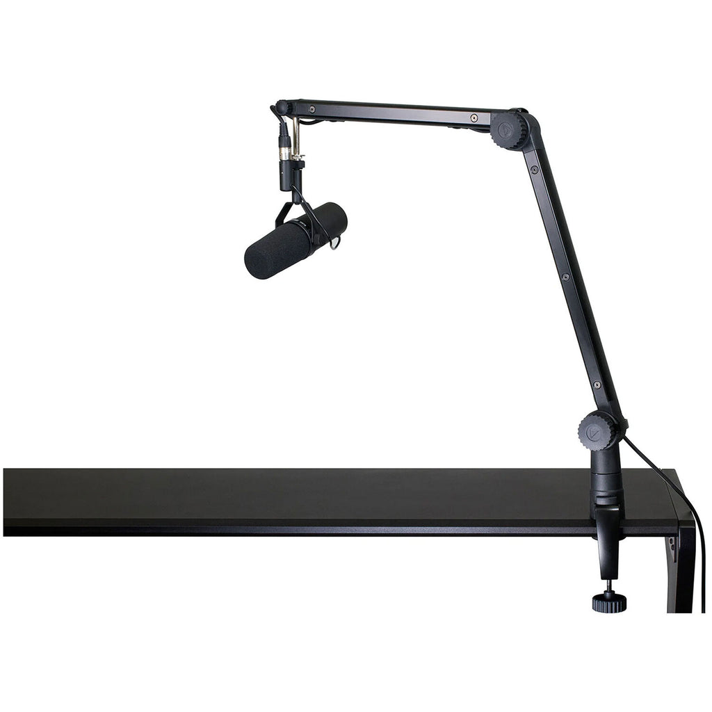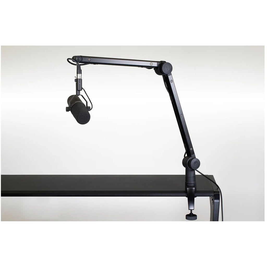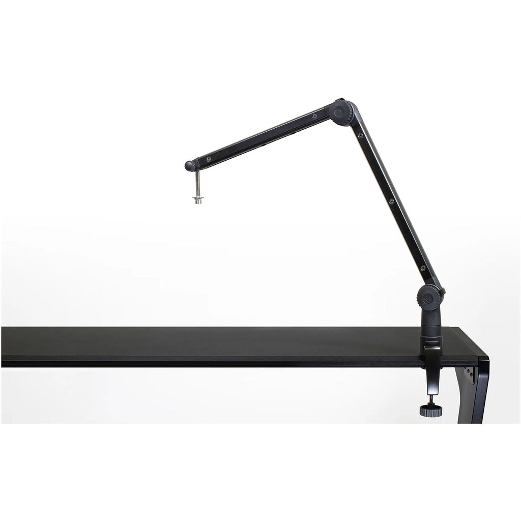 The BCM-300 deluxe broadcast mic stand brings fluid functionality and quality of life features together in a single sleek design. It offers a max height of 37" when fully extended. Locking arms allow the BCM-300 to easily secure your mic the way that fits your space the most. The extended drop features a 3.75" length. This gives side connecting mics like the SM7B more rotation options and adds utility for other models. The clamp based mounting system offers a dependable and flexible means of attaching to multiple desks, tables and other flat surfaces.