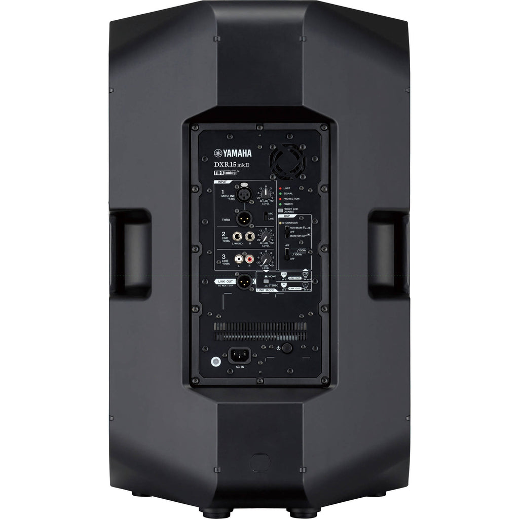 The Yamaha DXR15mkII is a 15" 1100W 2-Way active loudspeaker which provides clear audio and extremely high output levels in an unobtrusive and durable design, ideal for live sound applications that require wide bandwidth audio reproduction. The cabinet has a rugged ABS construction with a bass-reflex design for enhanced bass performance with reduced turbulence. The high-power 15" woofer and 1.75" compression tweeter offer high-resolution audio with a wide frequency response and deep bass. Integrated DSP uses a FIR-X linear phase filter for an ultra-smooth crossover, while the protection circuits optimize and protect driver performance.