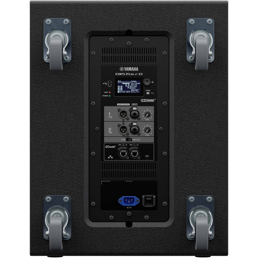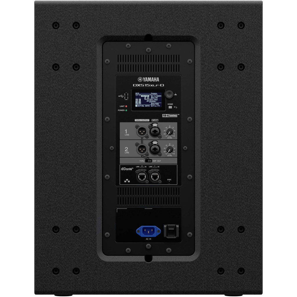 The rear panel offers two combo XLR-1/4" inputs with XLR thru/outputs and dedicated level controls. A USB port allows for system upgrades and preset configuration and backups. The DXS15XLF-D is equipped with an additional panel with two etherCON connectors (2-in/2-out) for interfacing with other Dante-compatible equipment such as other speakers and Yamaha's CL/QL/TF digital mixing consoles. The Yamaha DXS15XLF-D ships with a standard IEC power cord.