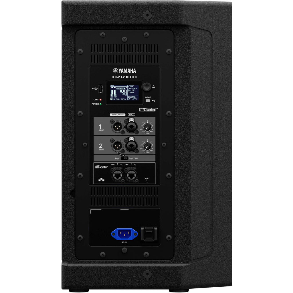 The rear panel offers two combo XLR-1/4" inputs with XLR thru/outputs and dedicated level controls. A USB port allows for system upgrades and preset configuration and backups. The DZR10-D is equipped with an additional panel with two etherCON connectors (2-in/2-out) for interfacing with other Dante-compatible equipment such as other speakers and Yamaha's CL/QL/TF digital mixing consoles. The Yamaha DZR10-D ships with a standard IEC power cord.