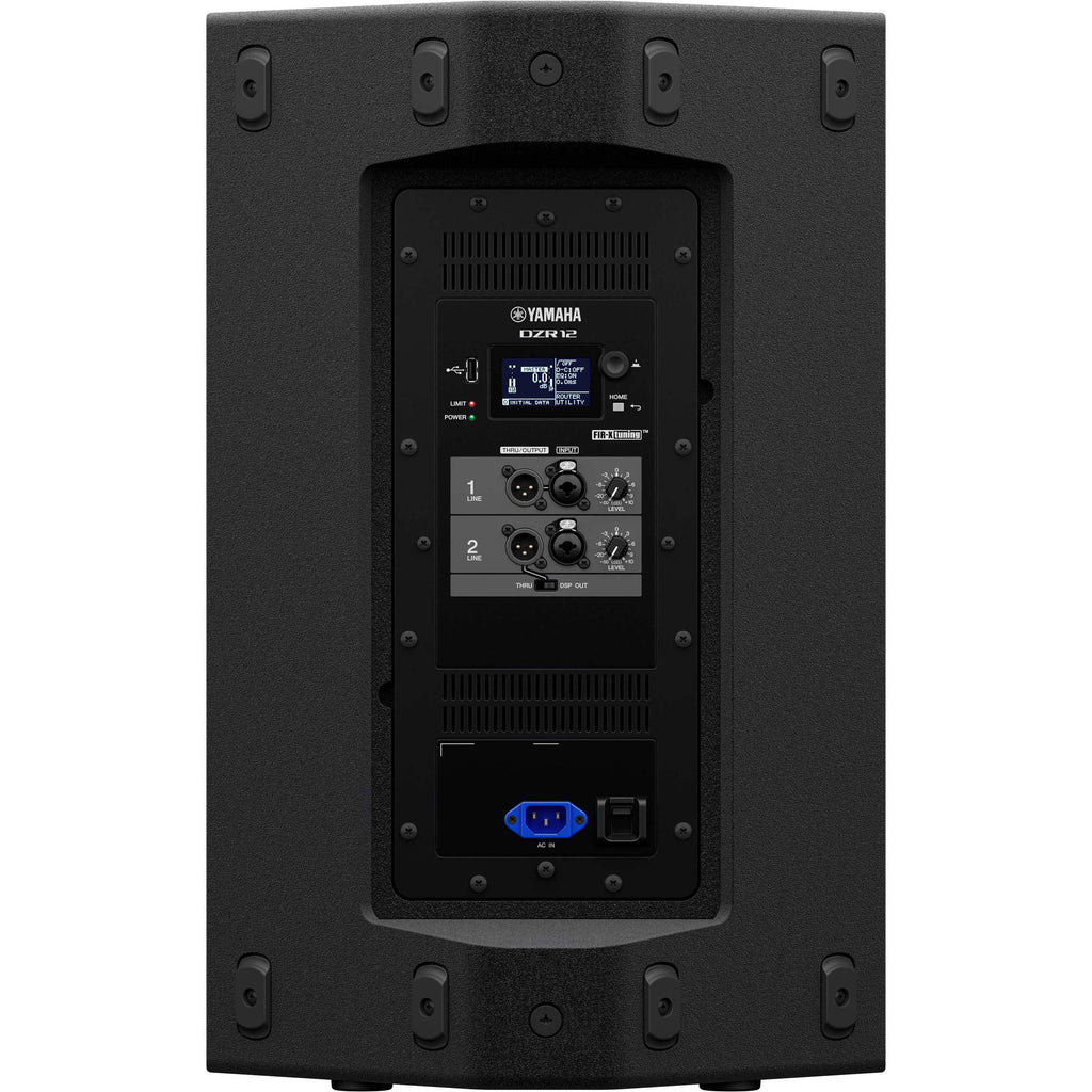 The rear panel offers two combo XLR-1/4" inputs with XLR thru/outputs and dedicated level controls. A USB port allows for system upgrades and preset configuration and backups. The Yamaha DZR12 ships with a standard IEC power cord.