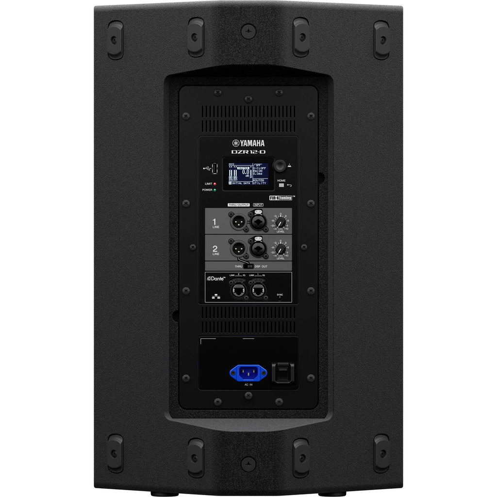 The rear panel offers two combo XLR-1/4" inputs with XLR thru/outputs and dedicated level controls. A USB port allows for system upgrades and preset configuration and backups. The DZR12-D is equipped with an additional panel with two etherCON connectors (2-in/2-out) for interfacing with other Dante-compatible equipment such as other speakers and Yamaha's CL/QL/TF digital mixing consoles. The Yamaha DZR12-D ships with a standard IEC power cord.