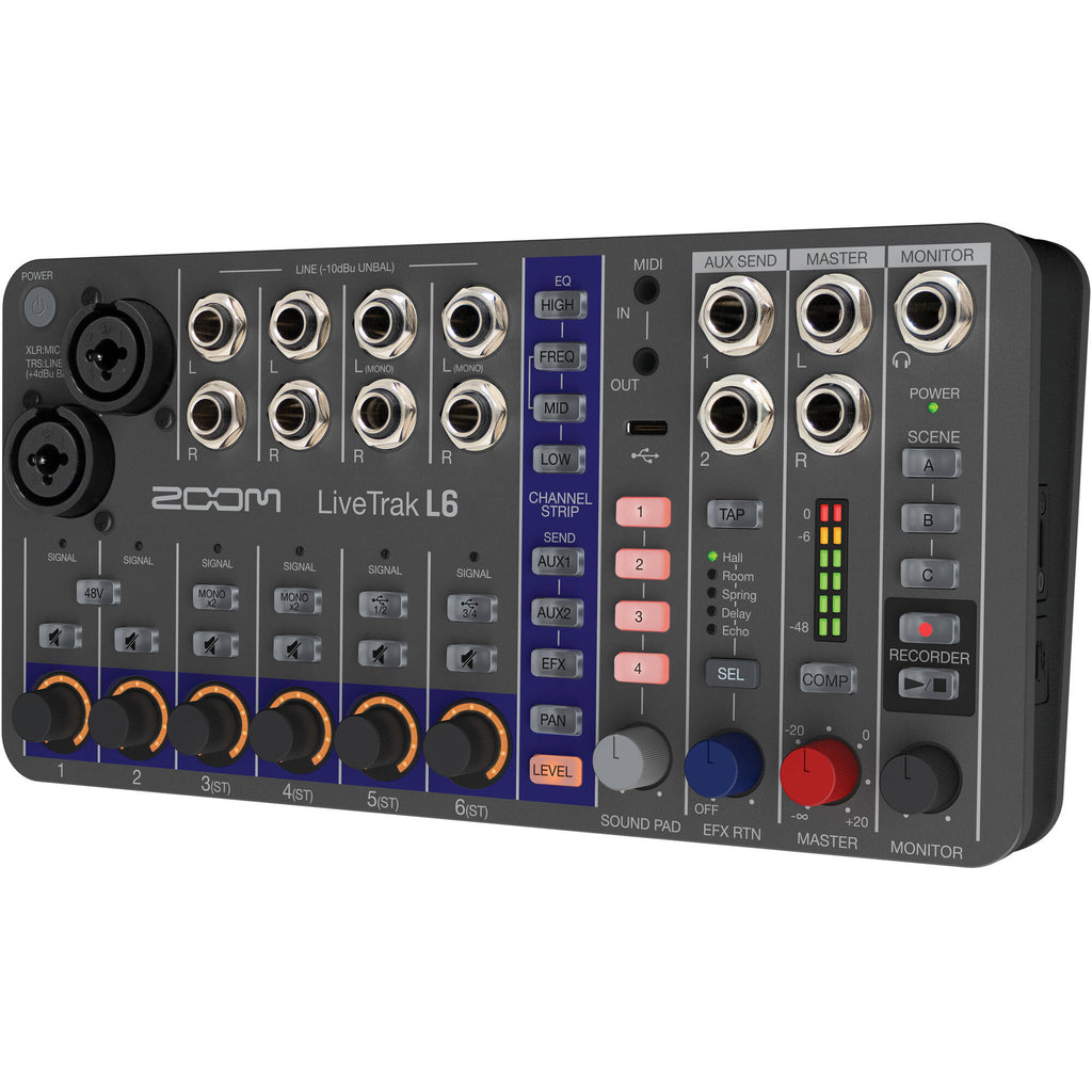 The LiveTrak L6 is our most compact and portable digital mixer / recorder. With 10-tracks of studio quality audio, effects, MIDI, and sound pads, it's perfect for bands, synth players, live streaming, and more.
