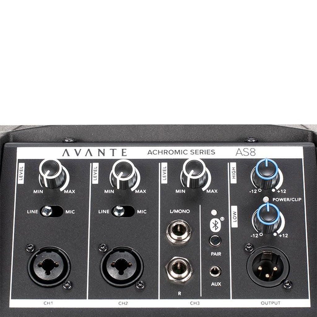 The fully-featured and easy to setup Achromic AS8 system comprises an active 8-inch subwoofer enclosure alongside two column units. One is loaded with six precision-aligned 2.75" speaker cones while the other serves as a spacer to lift the speaker column up to optimal height. Both feature Avante's new SAM (Secure Array Mount) system which allows the columns to lock securely to the sub and to one another without risk of being toppled over. The SAM connection also passes the audio signal from the sub up to the columns, removing the need for speaker cables, and allows the main column to connect directly to the sub without using the spacer if required, ideal for performances from a high stage.