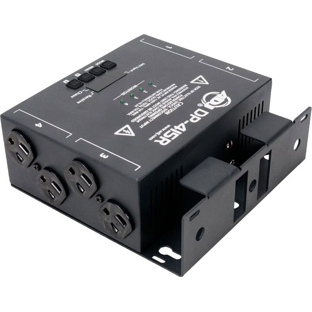 The ADJ DP-415R is a compact, portable 4-channel DMX dimmer/switch pack that has eight 3-prong 15 Amp Edison socket (2 for each channel) allowing you to be able to control up to 8 fixtures. The pack has a 4-button digital display menu and is RDM (Remote Device Management) compliant.