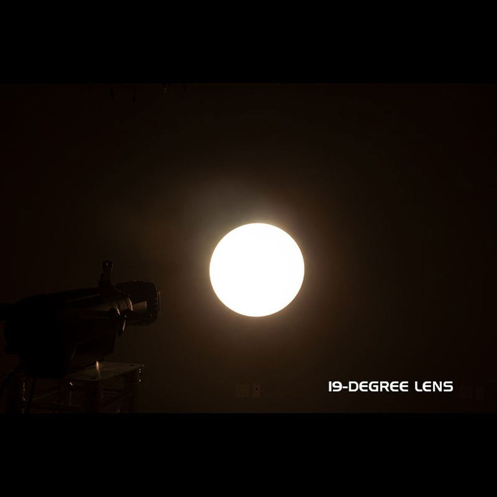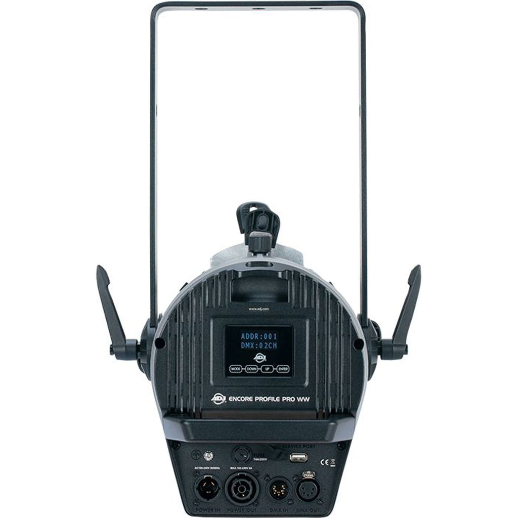 The Encore Profile Pro WW ellipsoidal features a high powered 260W Warm White >97CRI 3,200K LED engine producing 10,000+ total lumens, 14°, 19°, 26°, 36°, and 50° interchangeable high definition lens options (sold separately), (4) blade manual framing shutters, manual focus, supports B size metal HT transparency gobos, DMX controlled electronic strobe, and variable dimming curves and dimming modes, adjustable refresh frequency for flicker free operation for TV and FILM, locking 5-pin XLR In/Out and Locking Power In/Out, (4) button LCD control display panel, an integrated rigging yoke, quiet fan cooling, and a multi-voltage universal auto switching power supply (AC100-240v).